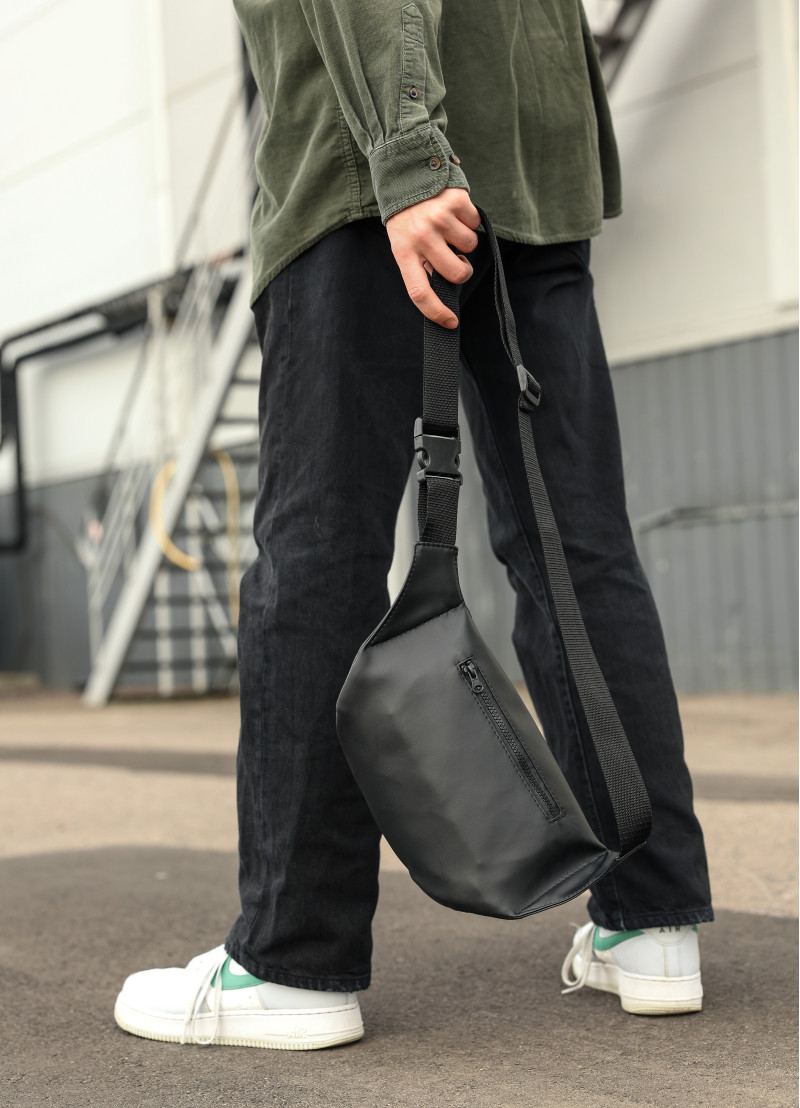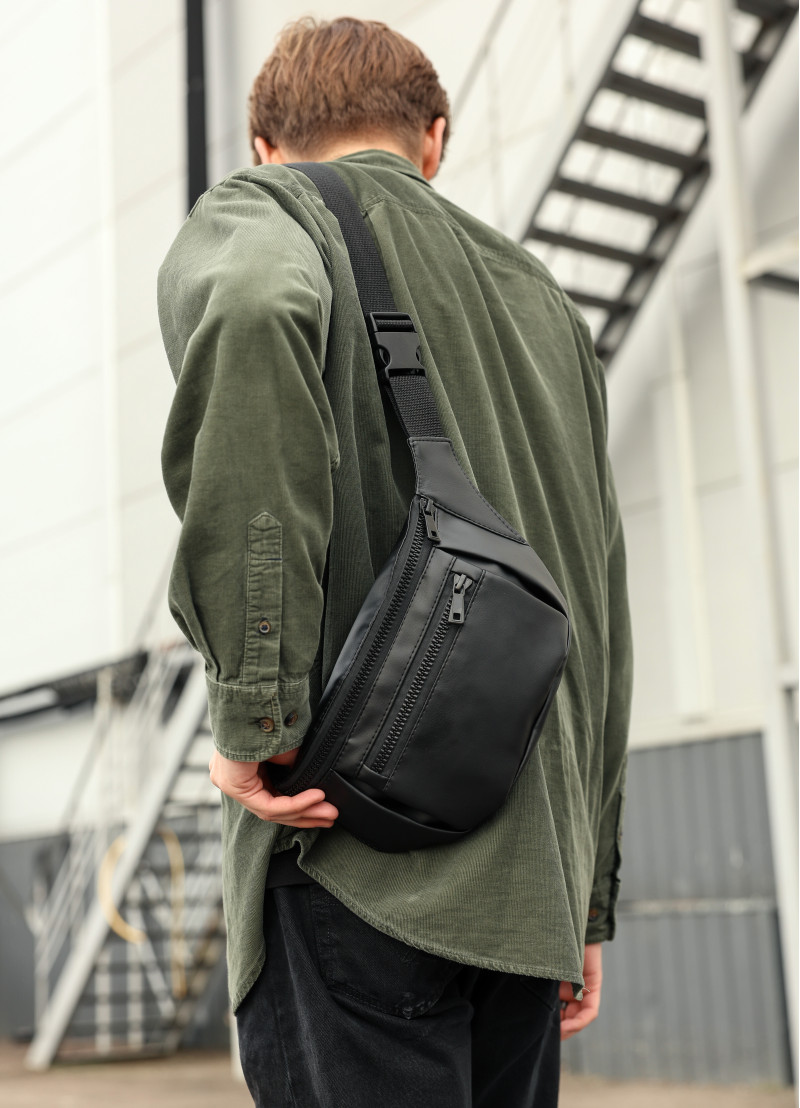 Чоловіча бананка Sambag Tirso Max чорного кольору виконана з екошкіри. В середині підкладка з матеріалу оксфорд. Основне відділення на пластиковій блискавці. Окрім основого відділення бананка має два додаткових зовінешніх відділення спереду та ззаду також на блискавках. Основне відділення має декліька кишень одне з яких на блискавці. Ремінець з текстилю регулюється від 110 см до 165 см.