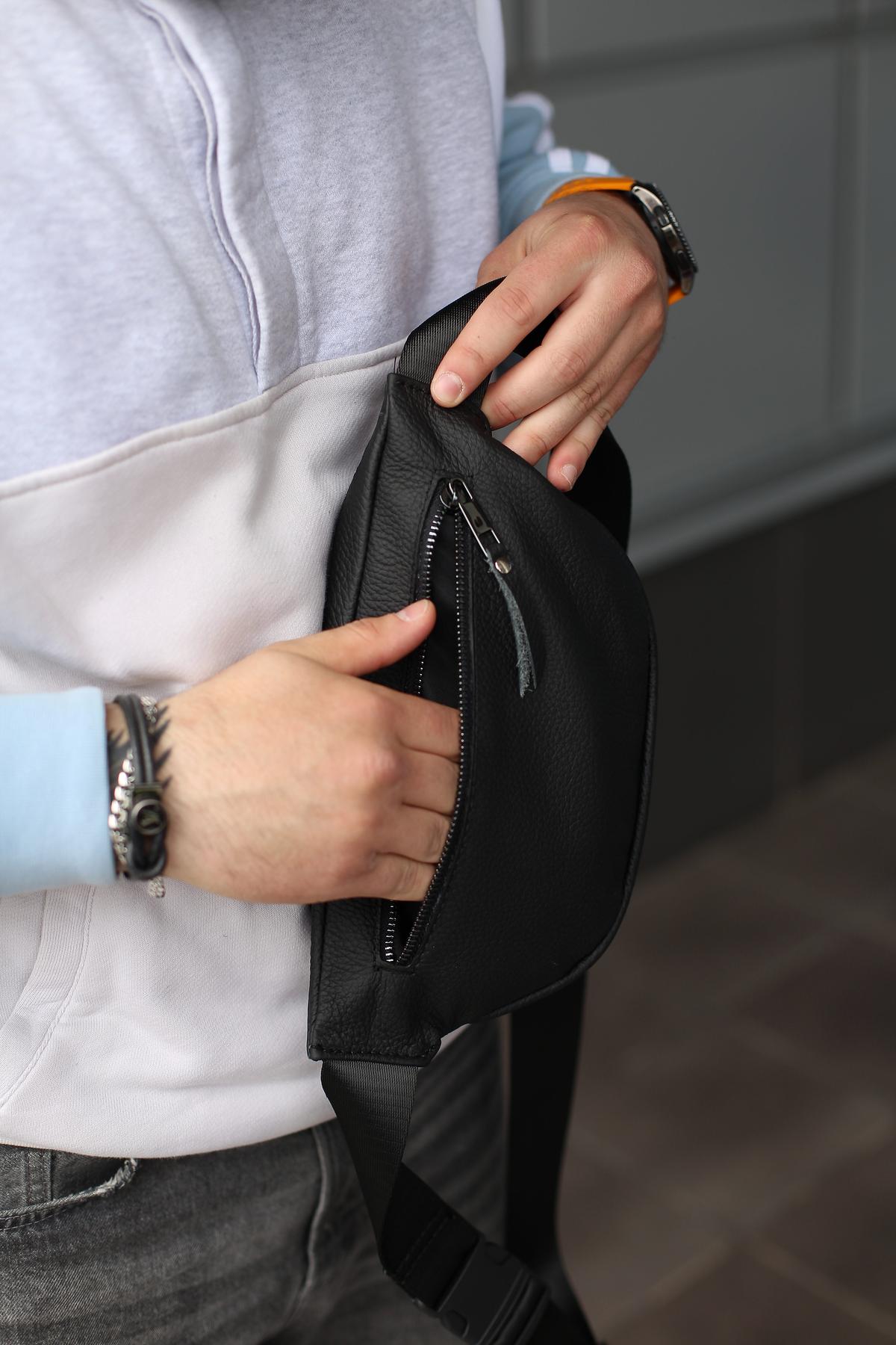 Чоловіча бананка Skill Line чорного кольору виконана із натуральної шкіри КРС. У бананки одне основне відділення, внутрішня кишеня на блискавці, а також додаткове відділення позаду. Всі відділення і карман на металевій блискавці. Ремінець регулюється до 105 см.