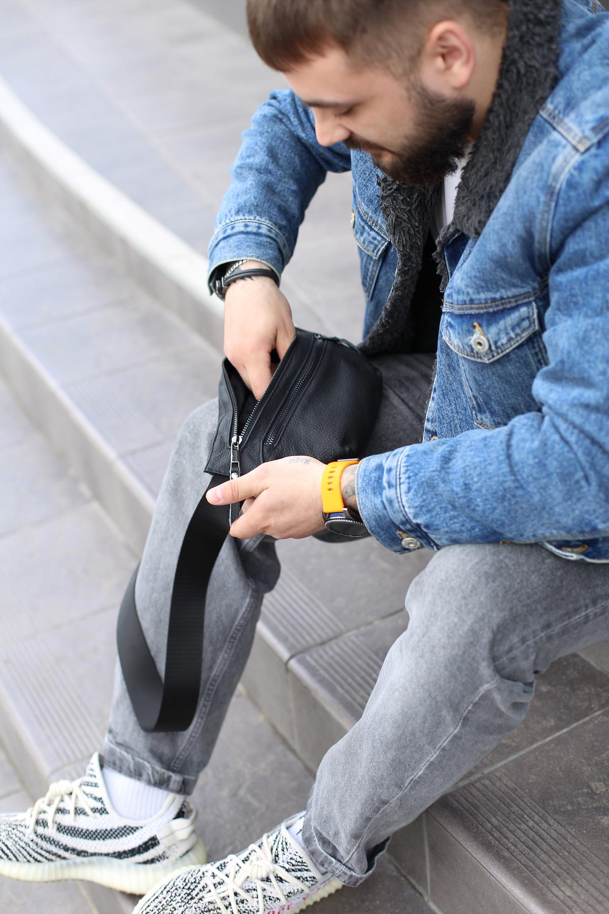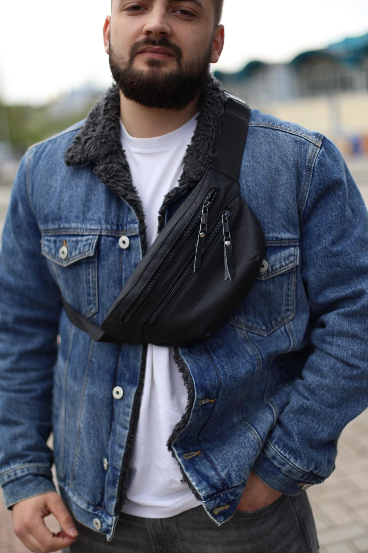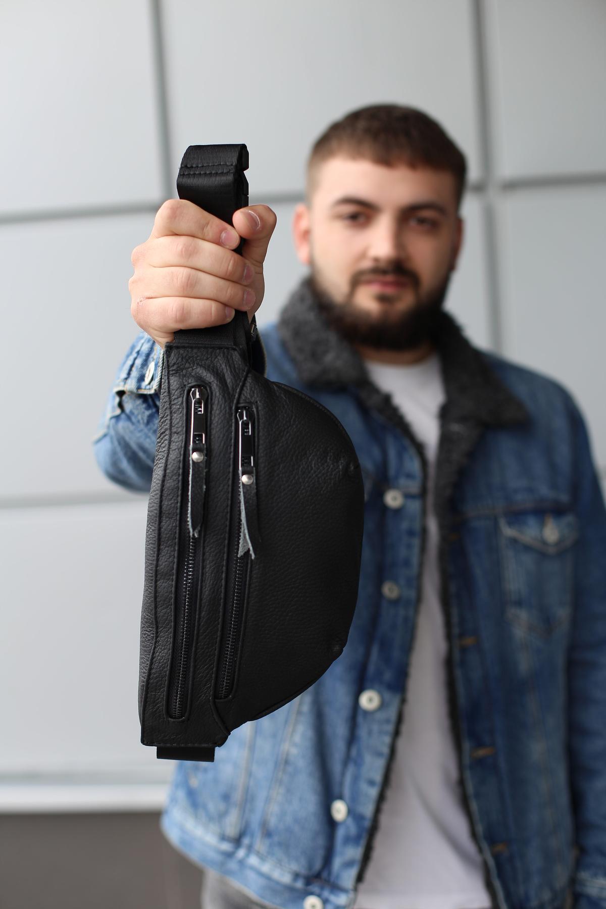 Чоловіча бананка Skill чорного кольору виконана із натуральної шкіри КРС. У бананки одне основне відділення, а також два додаткових спереду та ззаду, всі вони на металевій блискавці. Всередині основого відділення карман на блискавці. Ремінець регулюється до 100 см.