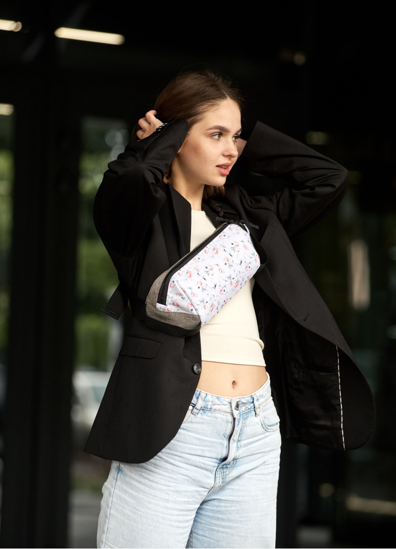 Жіноча тканинна бананка Sambag Holster MSH біло-сірого кольору з квітковим принтом виконана із тканини Оксфорд, яка має водовідштовхуючі властивості. Підкладка також виконана з данного матеріалу. Сумка оснащена металевою блискавкою та металевими бігунками з фіксаторами, тому самостійно сумка відкриватись не буде. Ззаду бананка має додаткову кишеню на блискавці. Всередині одне основне відділення з декількома кишенями. Ремінець регулюється від 100 до 145 см.
