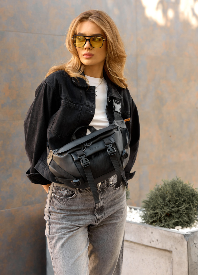 Жіноча сумка-бананка Sambag Dynamicdart чорного кольору має 9 відділень та виконана з якісного поліестеру. В середині підкладка з матеріалу оксфорд. Сумка має якісну пластикову блискавку з металевими бігунками з фіксаторами, тому самостійно сумка відкриватись не буде. Окрім основого відділення бананка має дві відкриті кишені, одну велику кишеню на блискавці в якій ще три відкриті кишені. На зовнішній стороні спереду карман із сітки. Позаду бананки дві відкриті кишені. Ремінець регулюється від 86 см до 168 см, завдяки чому її можна зручно носити як поясну сумку, так і як повноцінну через плече.