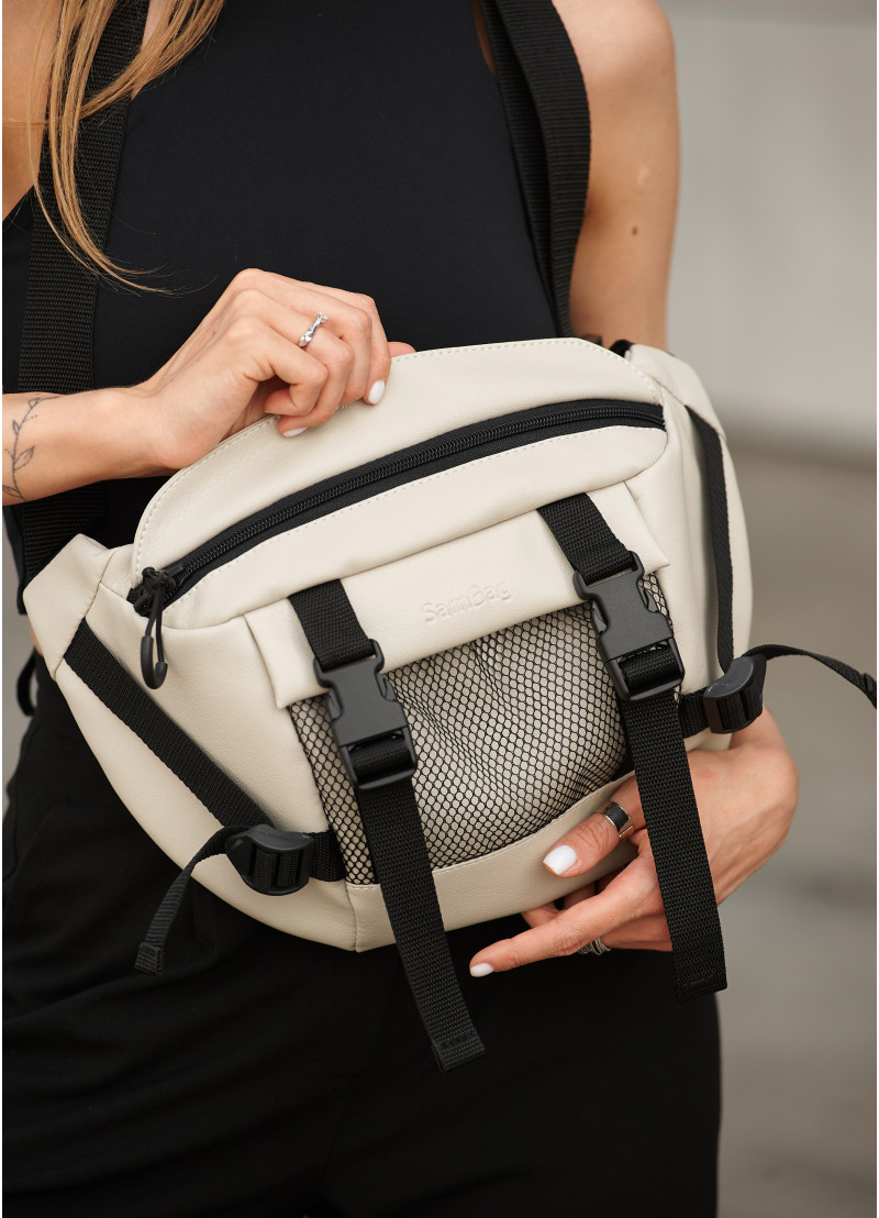 Жіноча сумка-бананка Sambag Dynamicdart сірого кольору має 9 відділень та виконана з якісного поліестеру. В середині підкладка з матеріалу оксфорд. Сумка має якісну пластикову блискавку з металевими бігунками з фіксаторами, тому самостійно сумка відкриватись не буде. Окрім основого відділення бананка має дві відкриті кишені, одну велику кишеню на блискавці в якій ще три відкриті кишені. На зовнішній стороні спереду карман із сітки. Позаду бананки дві відкриті кишені. Ремінець регулюється від 86 см до 168 см, завдяки чому її можна зручно носити як поясну сумку, так і як повноцінну через плече.