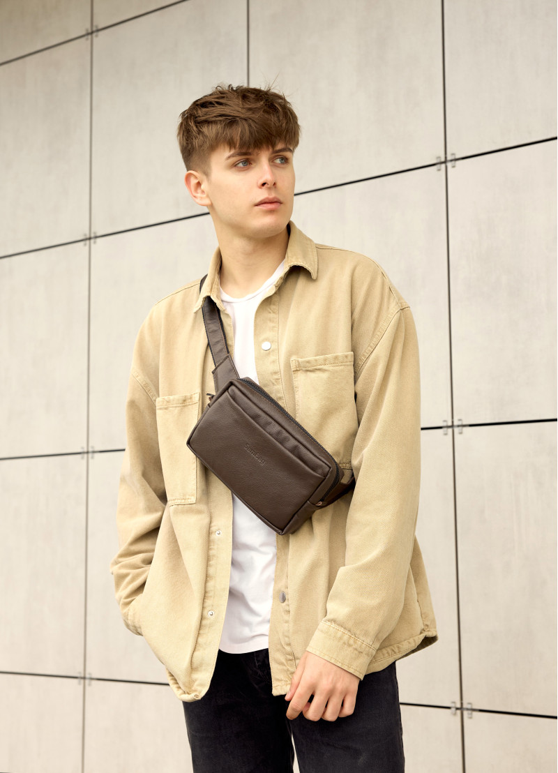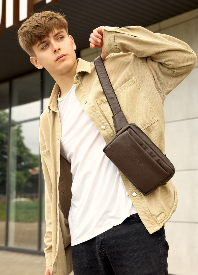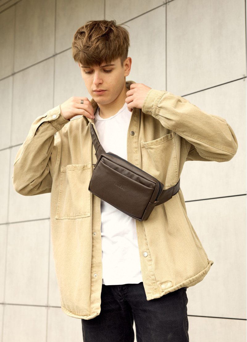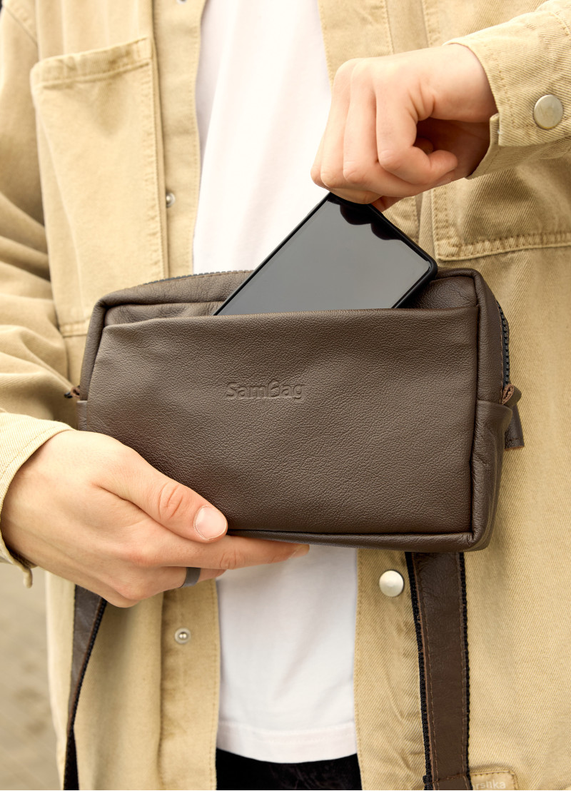 Мужская бананка Sambag Harvi коричневого цвета выполнена из натуральной эластичной кожи, которая обладает водоотталкивающими свойствами и является износостойкой.