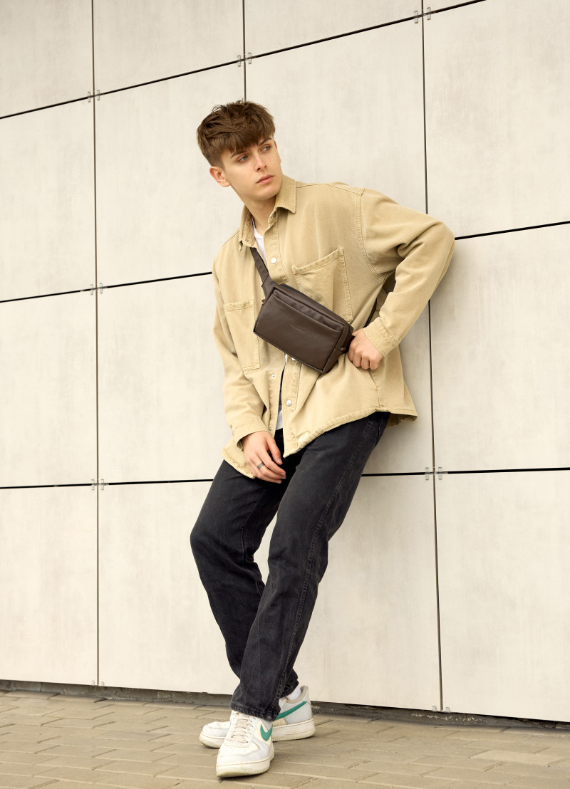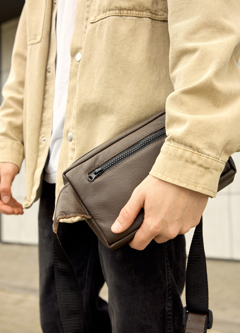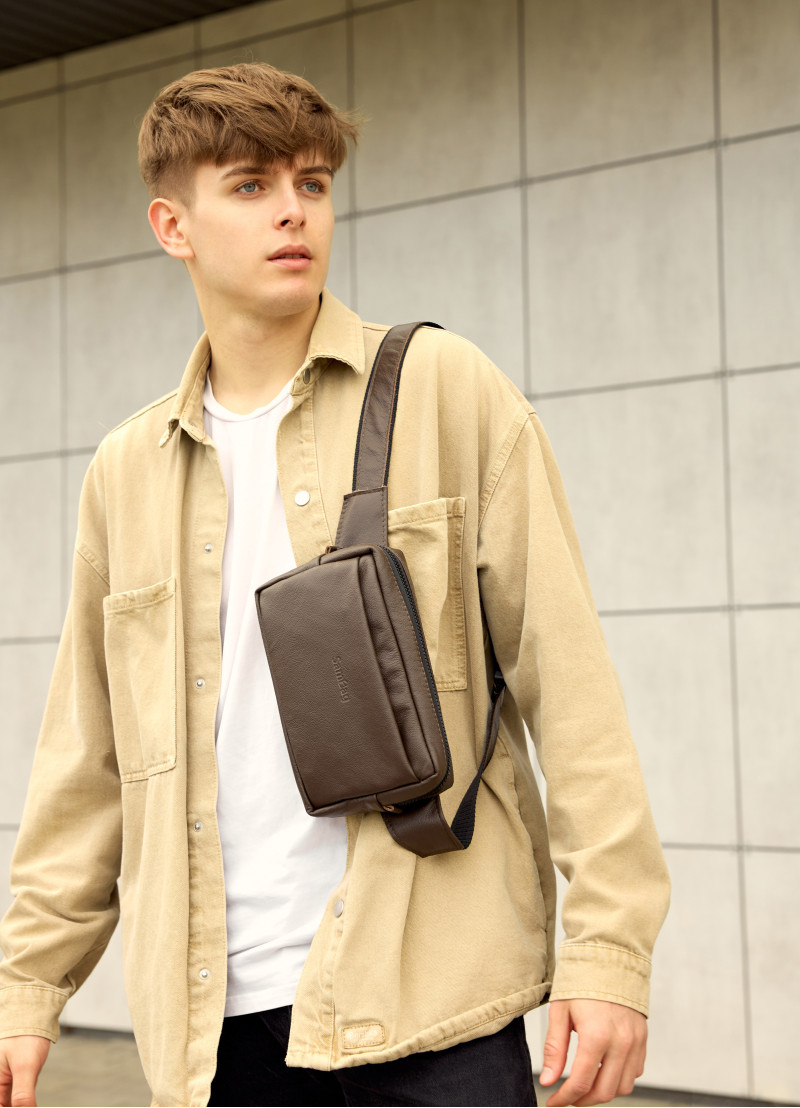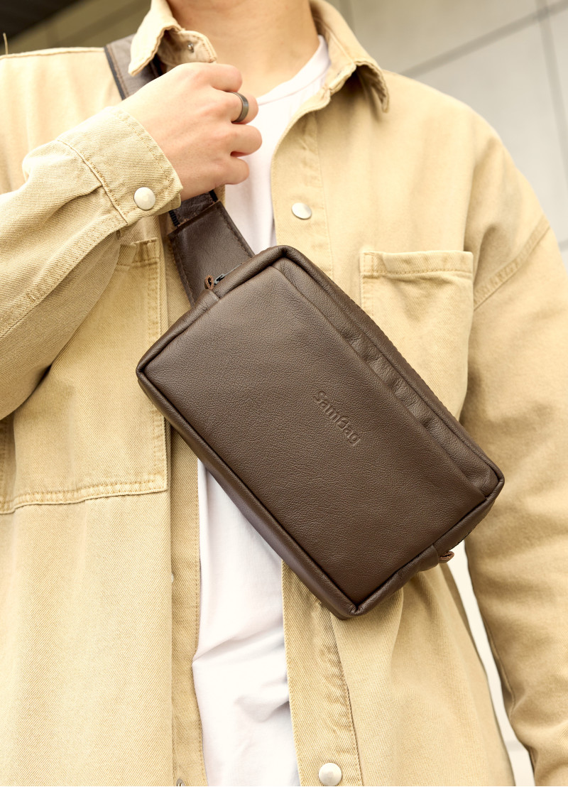 Мужская бананка Sambag Harvi коричневого цвета выполнена из натуральной эластичной кожи, которая обладает водоотталкивающими свойствами и является износостойкой.