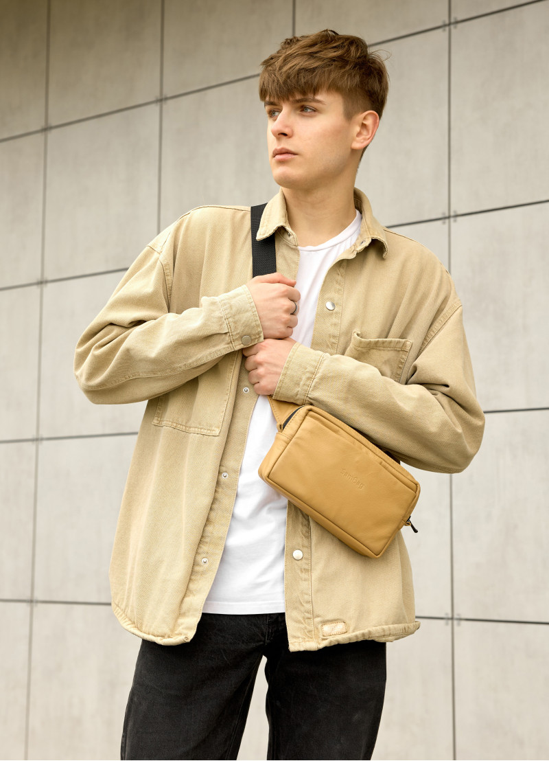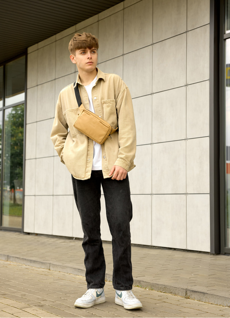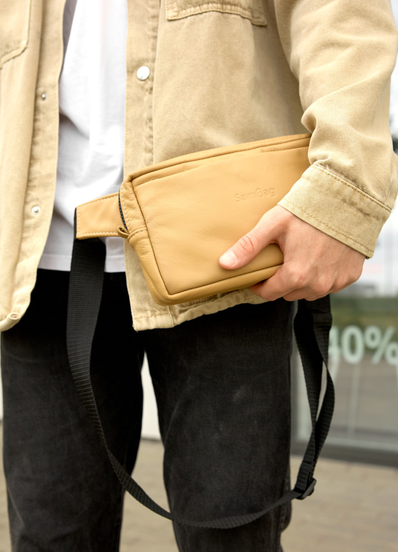 Мужская бананка Sambag Harvi бежевого цвета выполнена из натуральной эластичной кожи, которая обладает водоотталкивающими свойствами. В середине подкладка из материала оксфорда. Подкладка берет на себя нагрузку, благодаря чему срок службы бананки значительно увеличивается. Она имеет качественную пластиковую молнию с металлическими бегунками с фиксаторами. Спереди бананка имеет дополнительный карман на магните. Сзади дополнительный маленький карман на молнии. Внутри сумки несколько отделений, одно из которых на молнии. Ремешок регулируется от 86 до 123 см, благодаря чему ее можно удобно носить как на поясе, так и на плече.