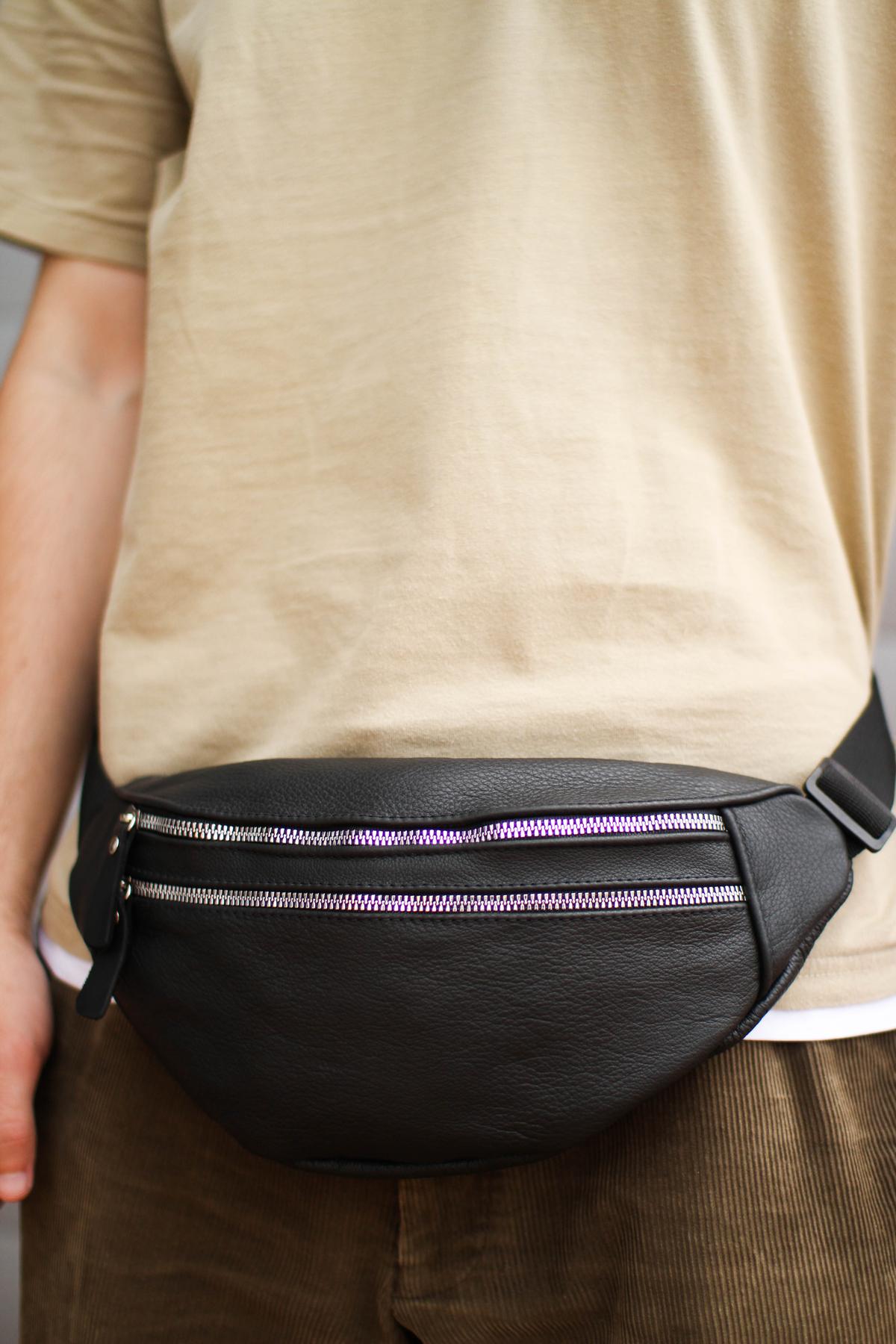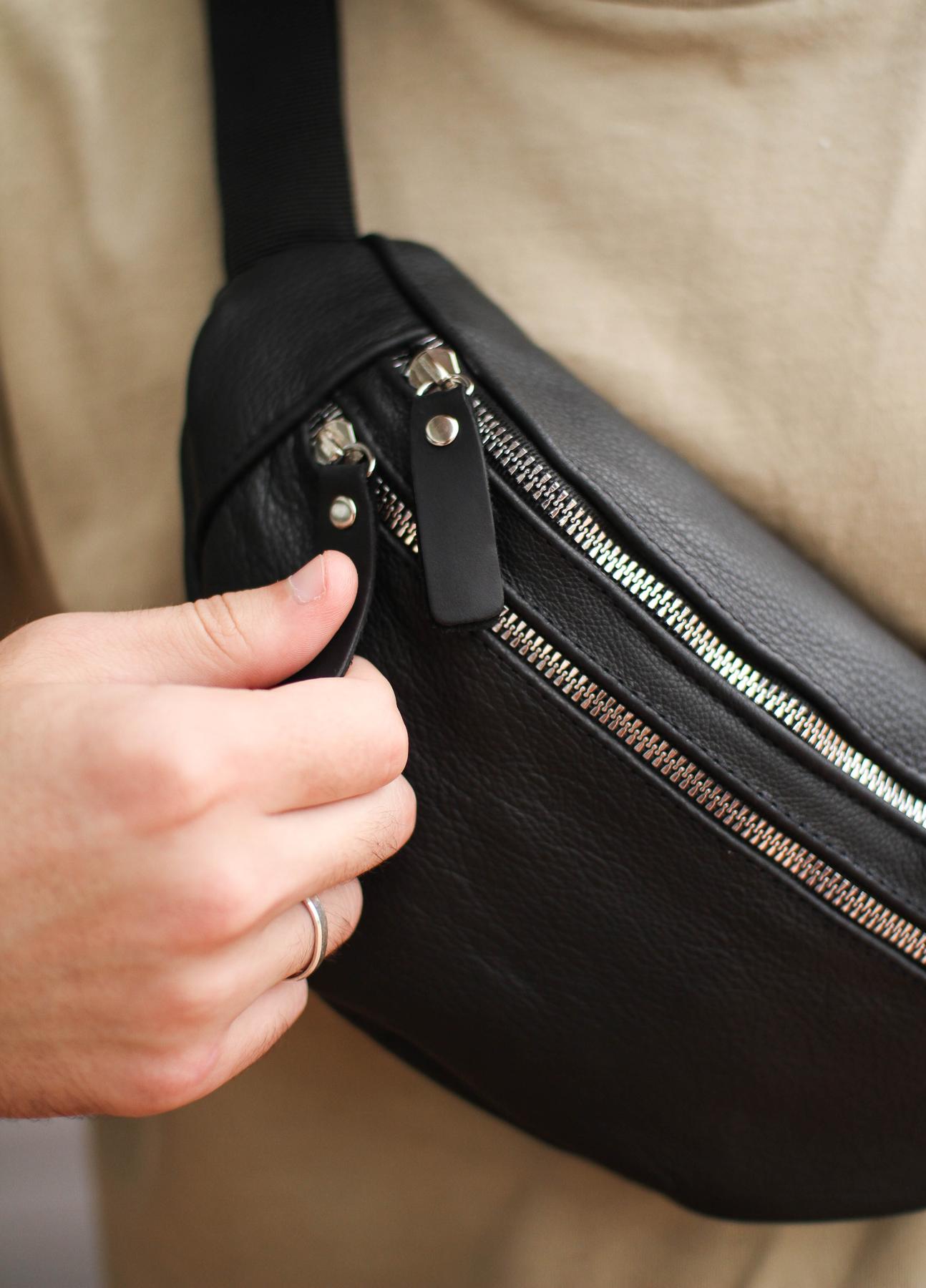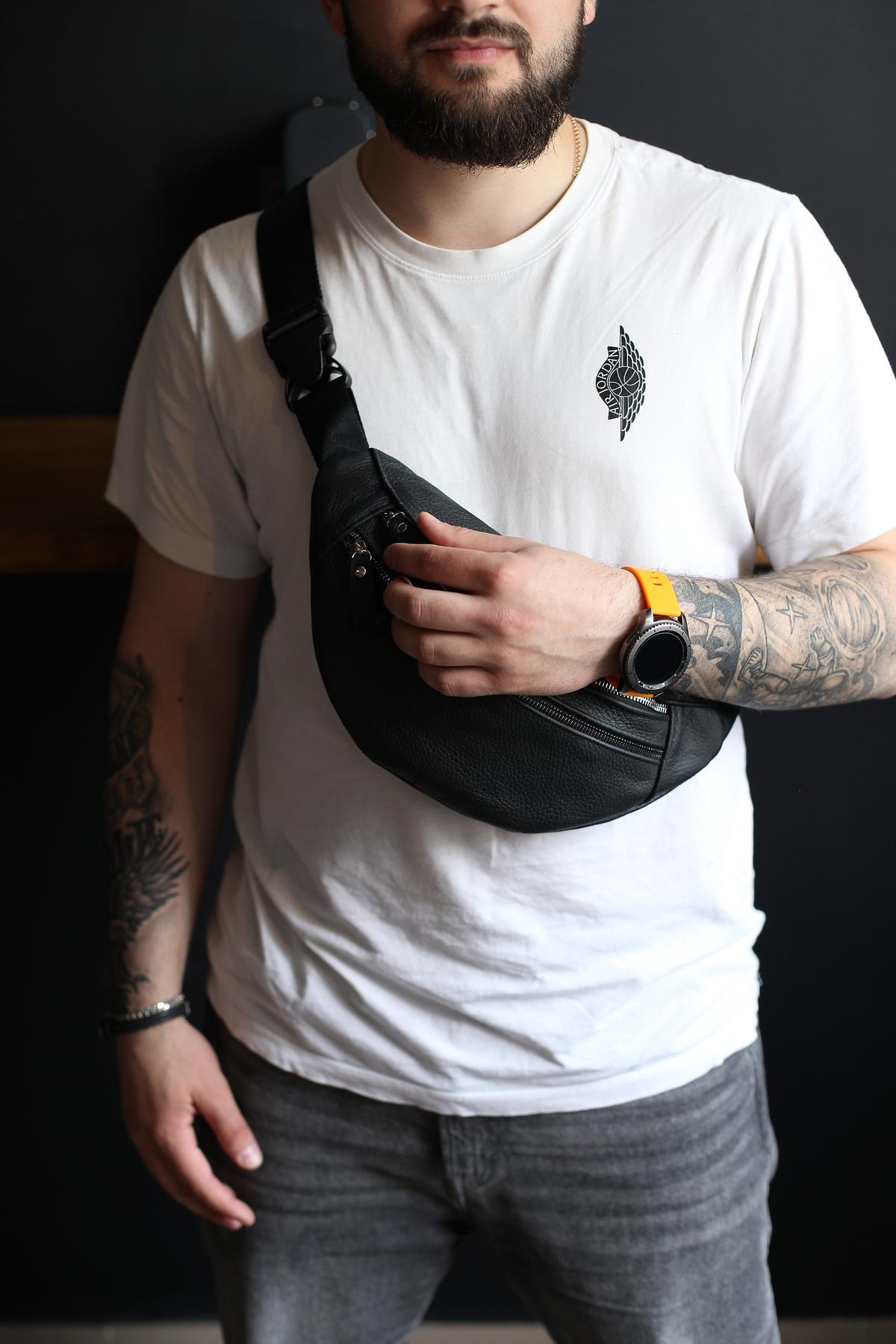 Мужская бананка Skill черного цвета выполнена из натуральной кожи КРС. У бананки одно основное отделение с карманом на молнии, а также дополнительное отделение спереди. Молнии металлические. Ремешок регулируется до 100 см.