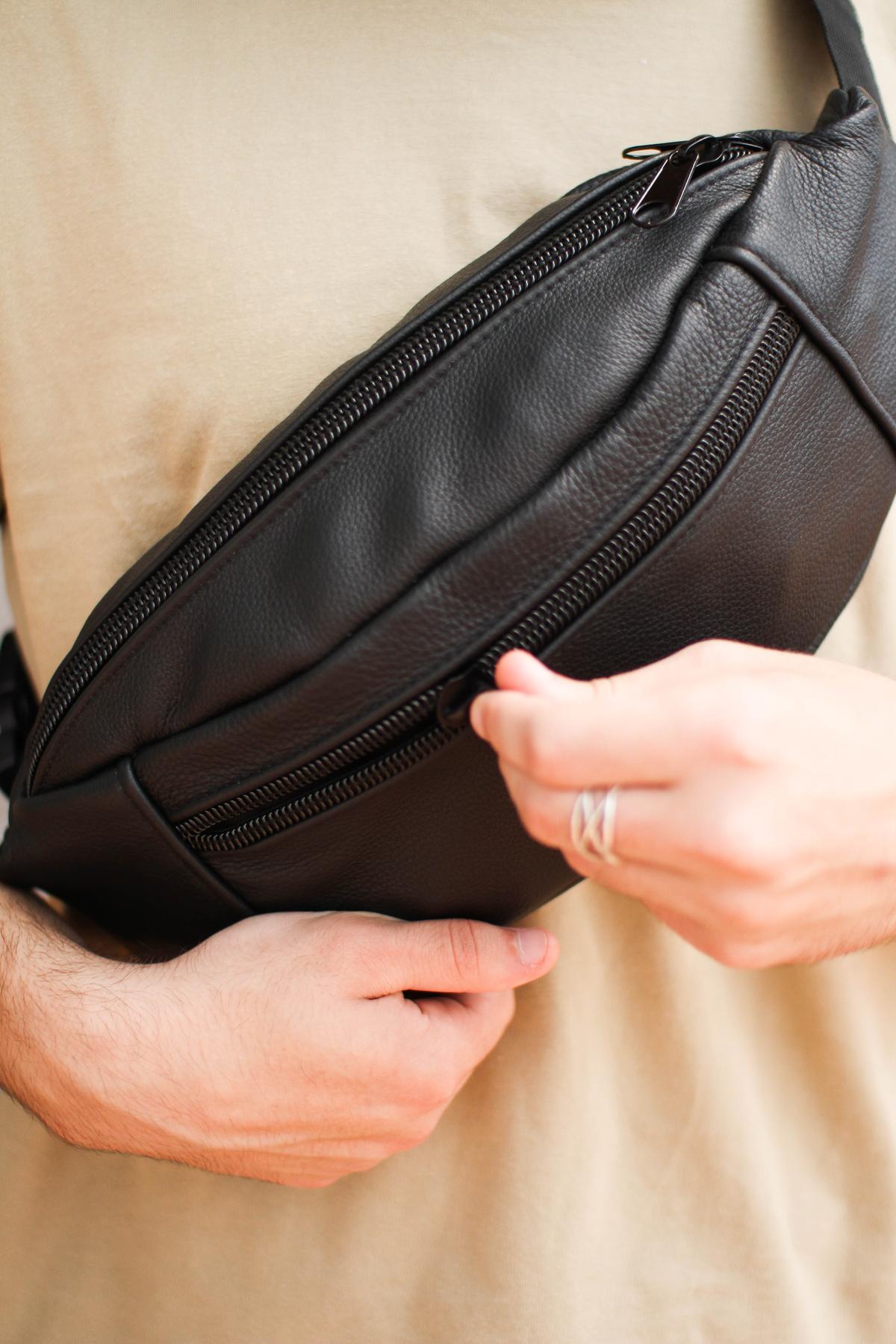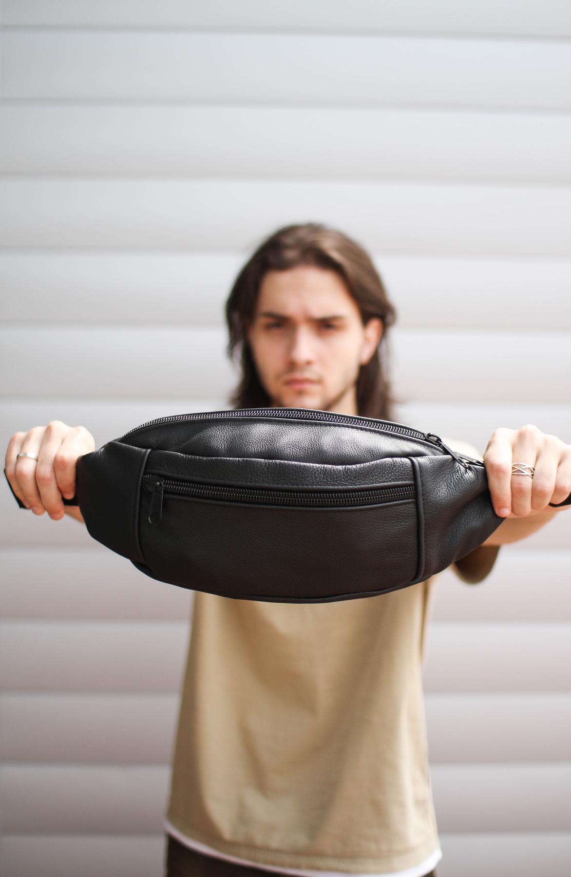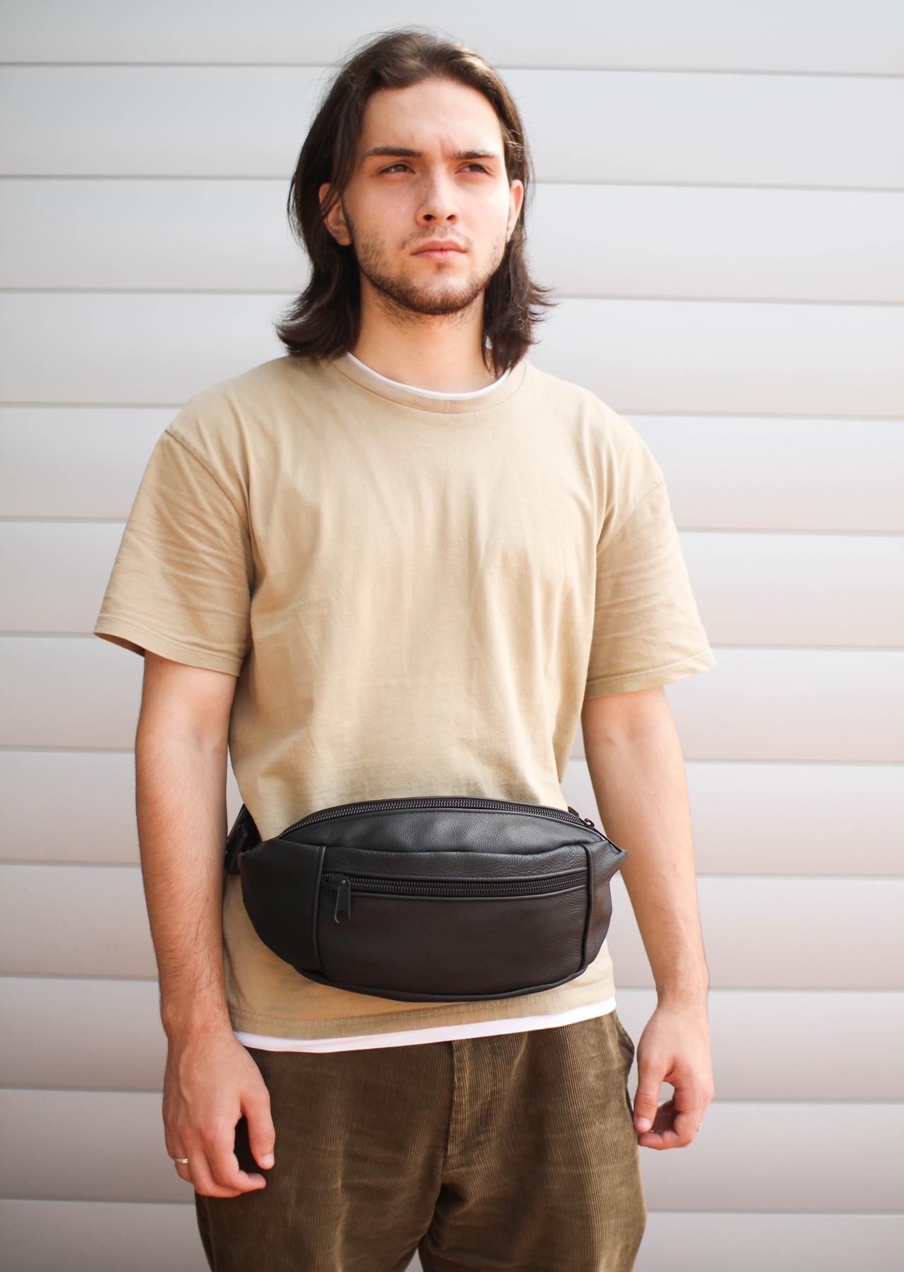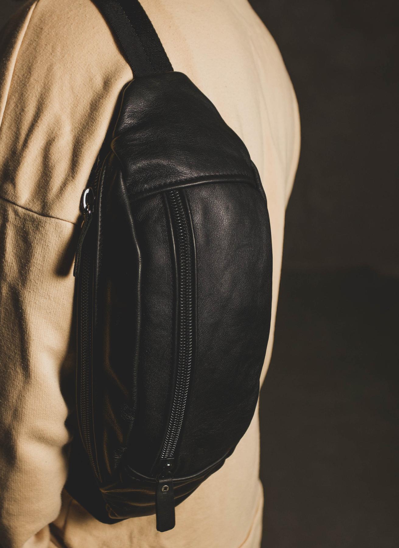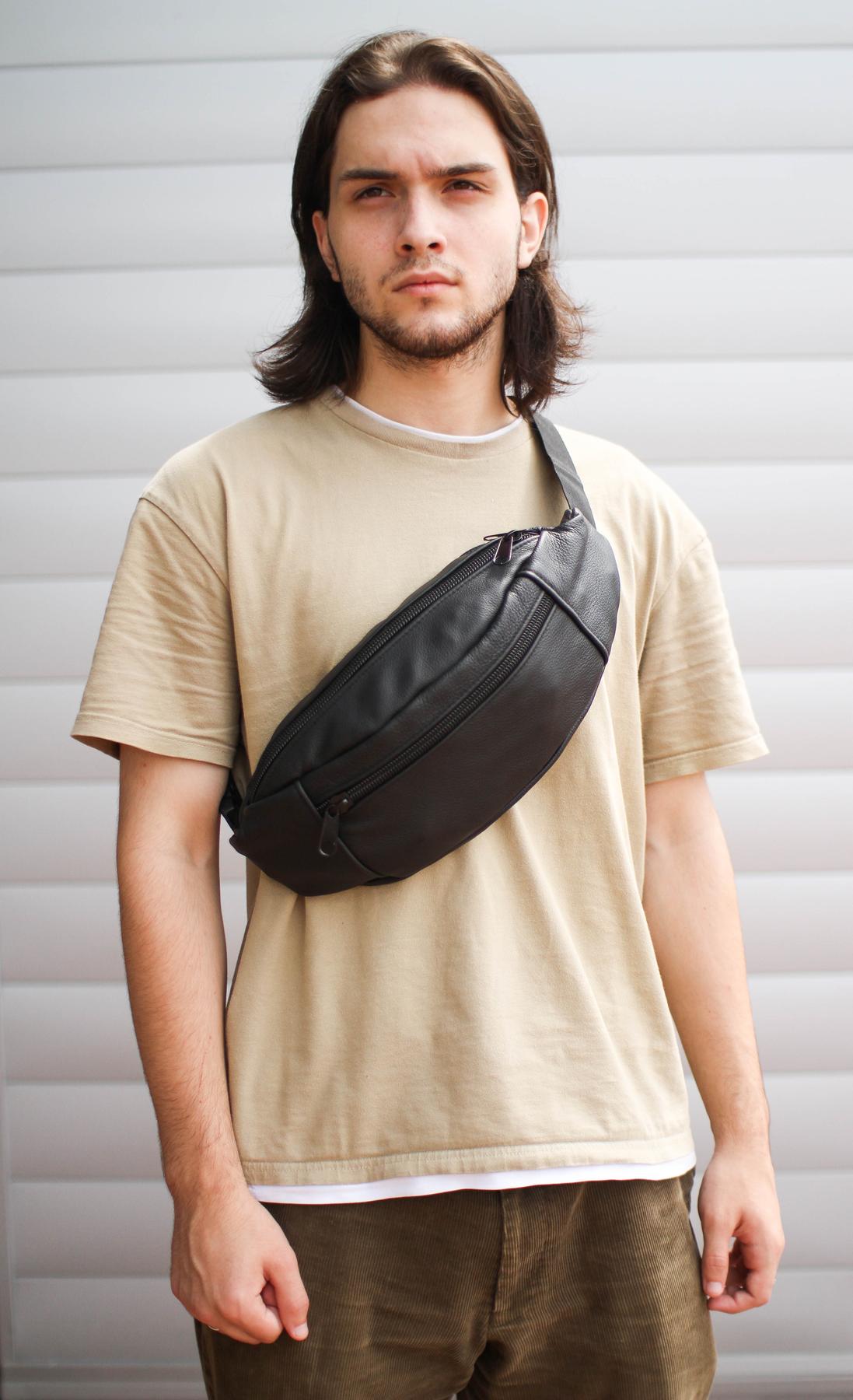 Мужская бананка Skill черного цвета выполнена из натуральной кожи КРС. У бананки одно основное отделение с карманом, а также дополнительное отделение спереди на пластиковых молниях. Ремешок регулируется до 125 см.