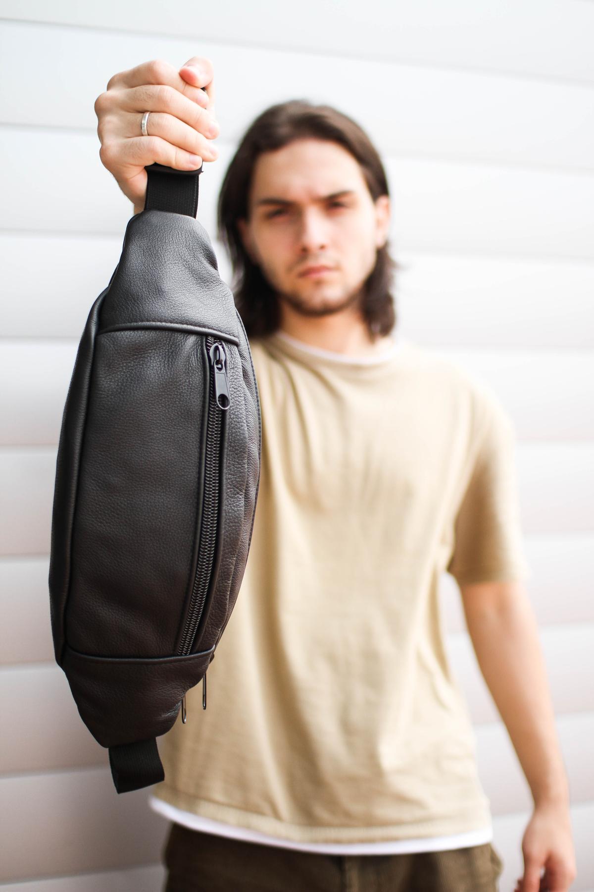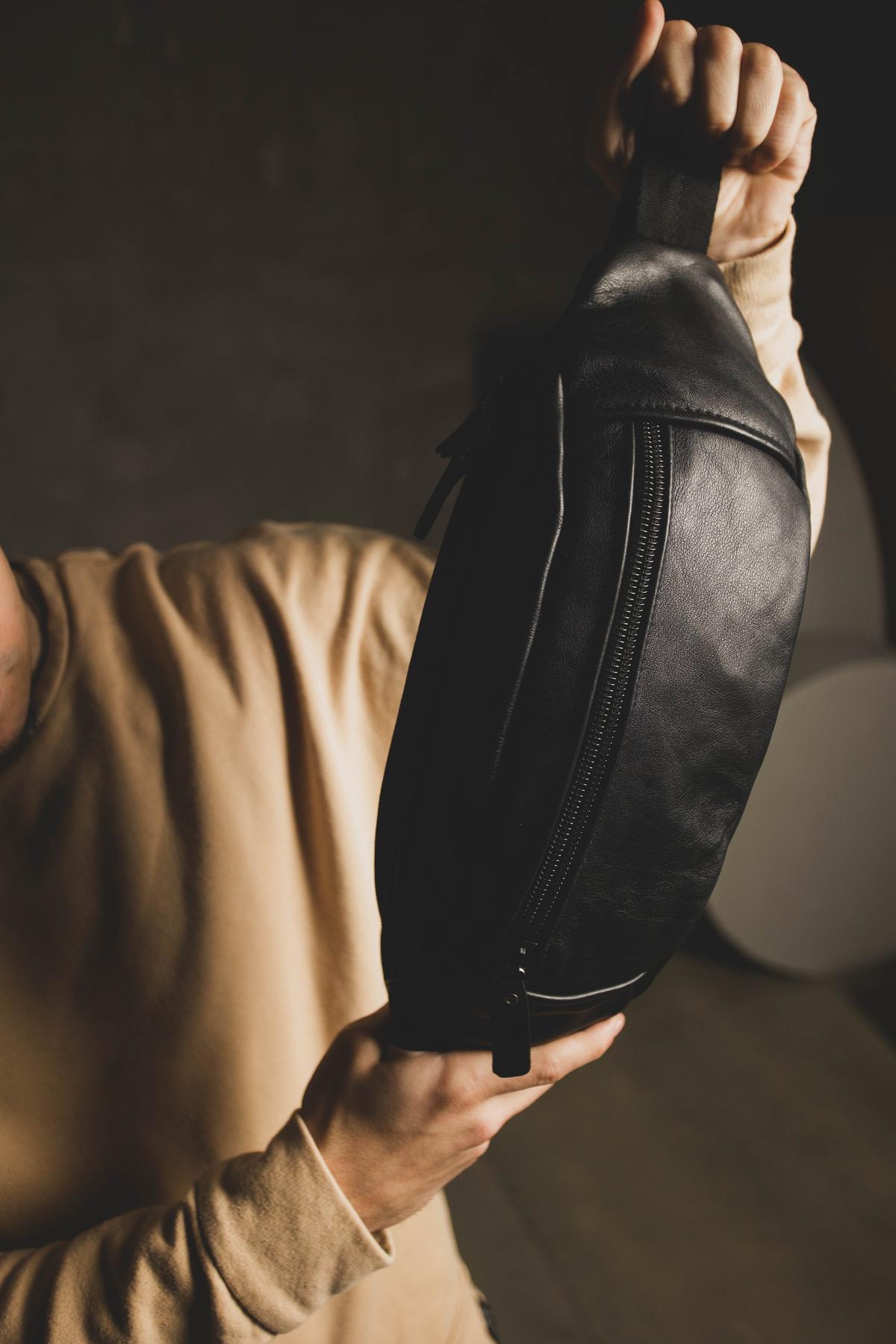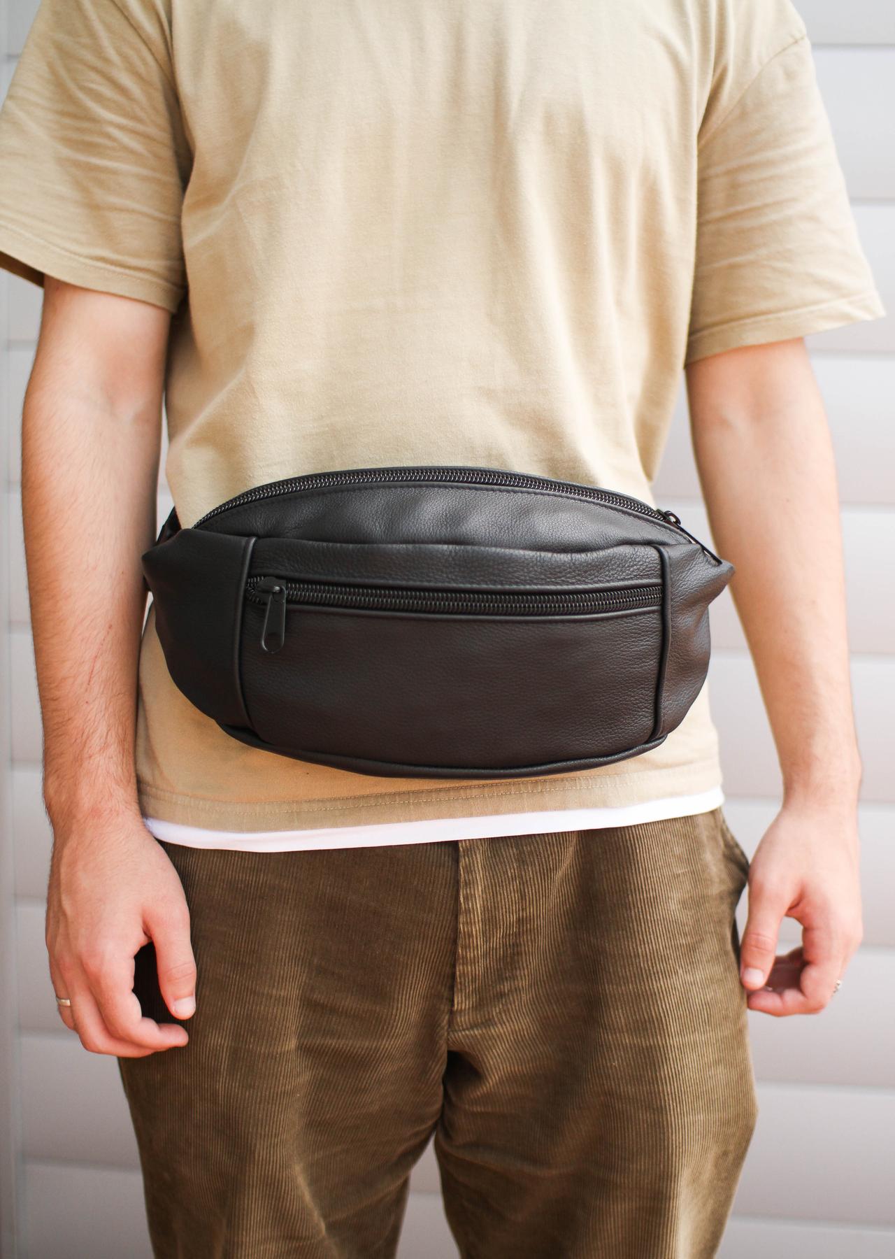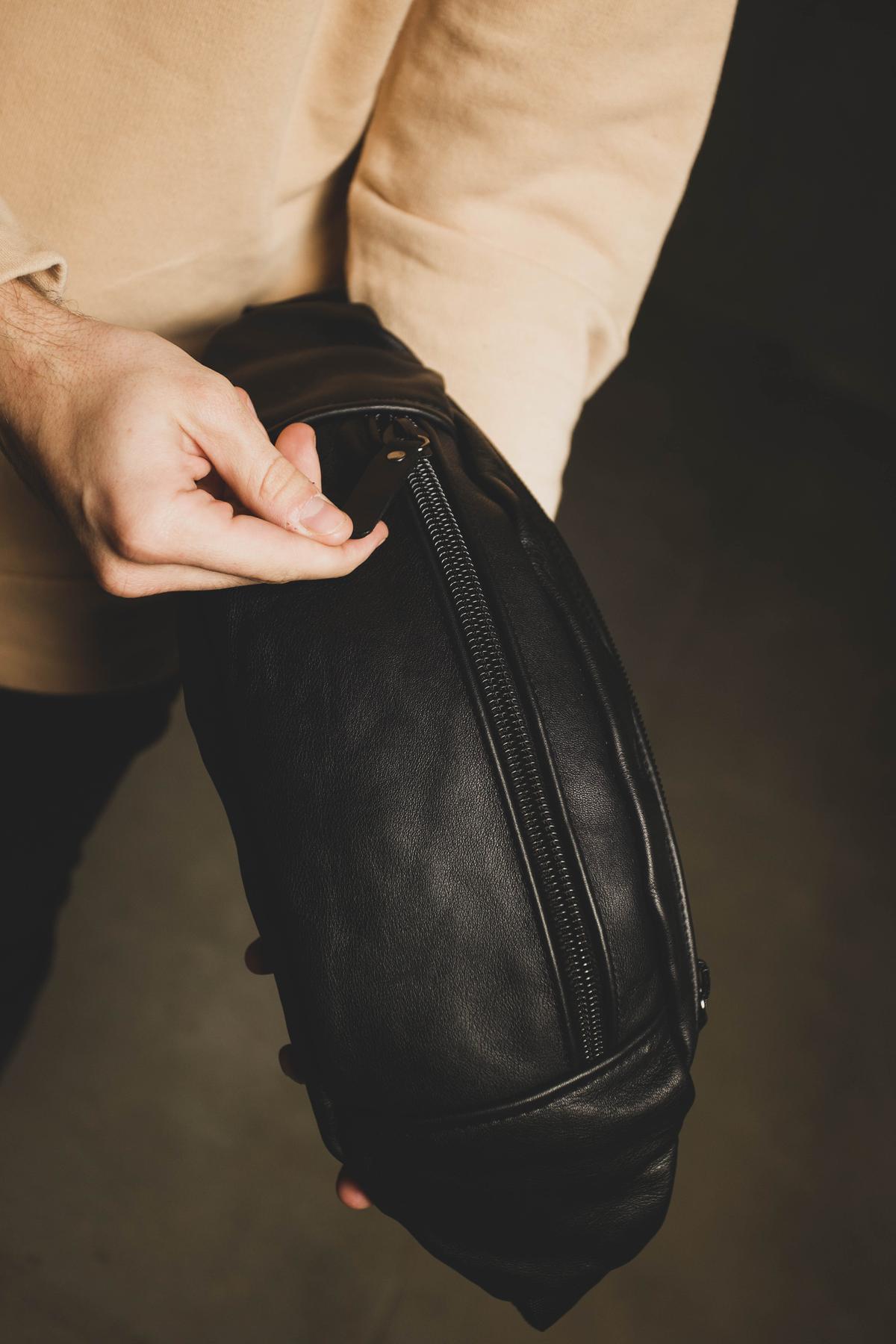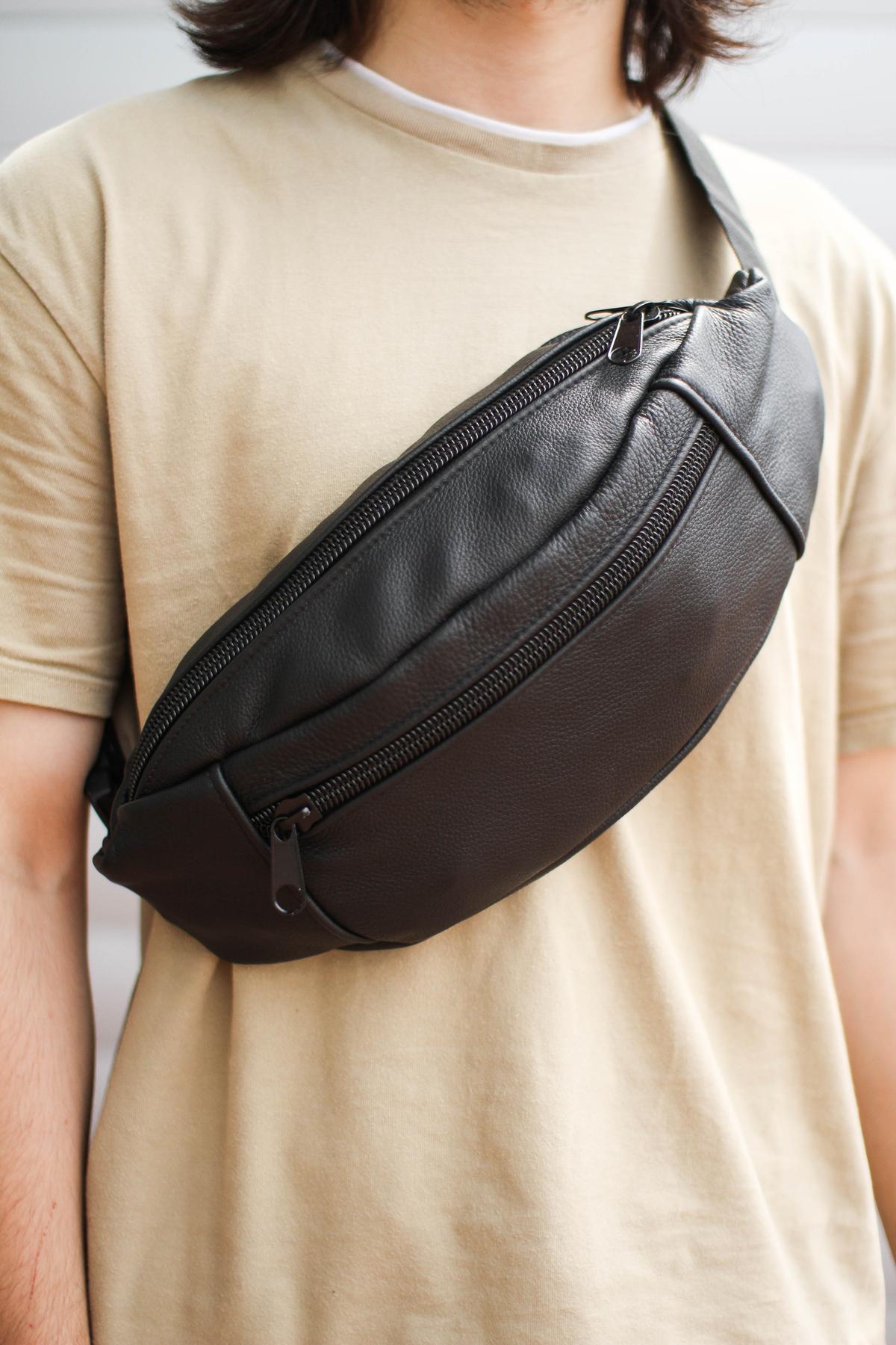 Мужская бананка Skill черного цвета выполнена из натуральной кожи КРС. У бананки одно основное отделение с карманом, а также дополнительное отделение спереди на пластиковых молниях. Ремешок регулируется до 125 см.