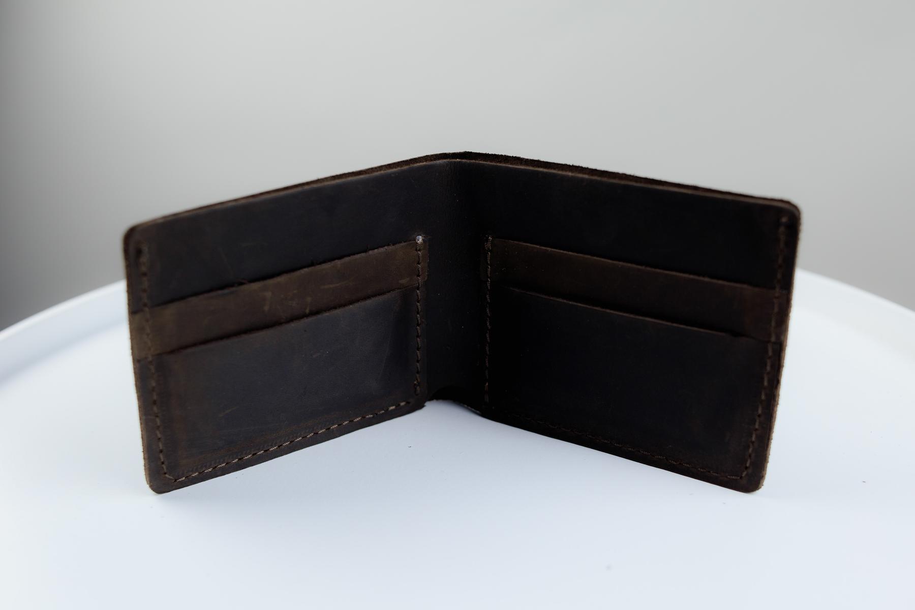 Мужской кошелек бифолд Skill коричневого цвета выполнен из натуральной кожи. Кошелек застегивается металлической кнопкой, имеет основное отделение для купюр, 4 ячейки для карточек и одно отделение для монет на кнопке.