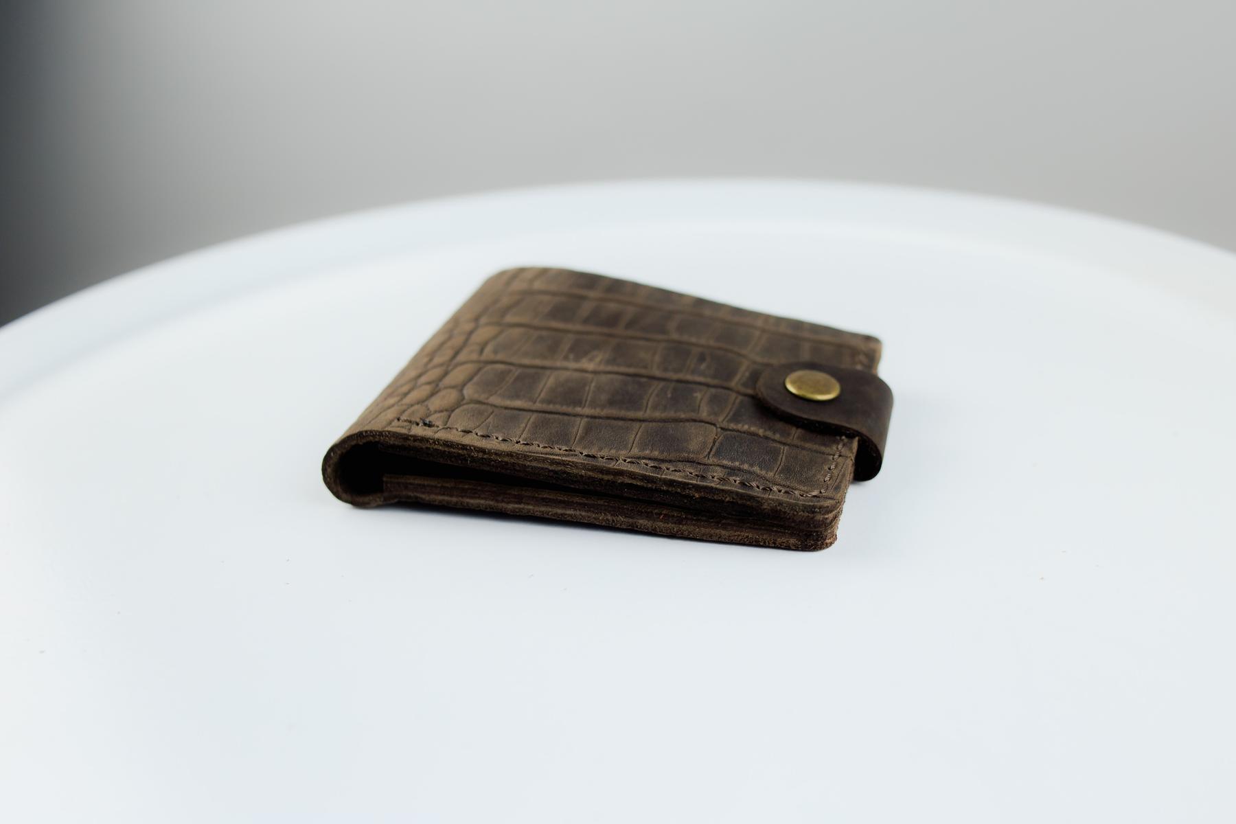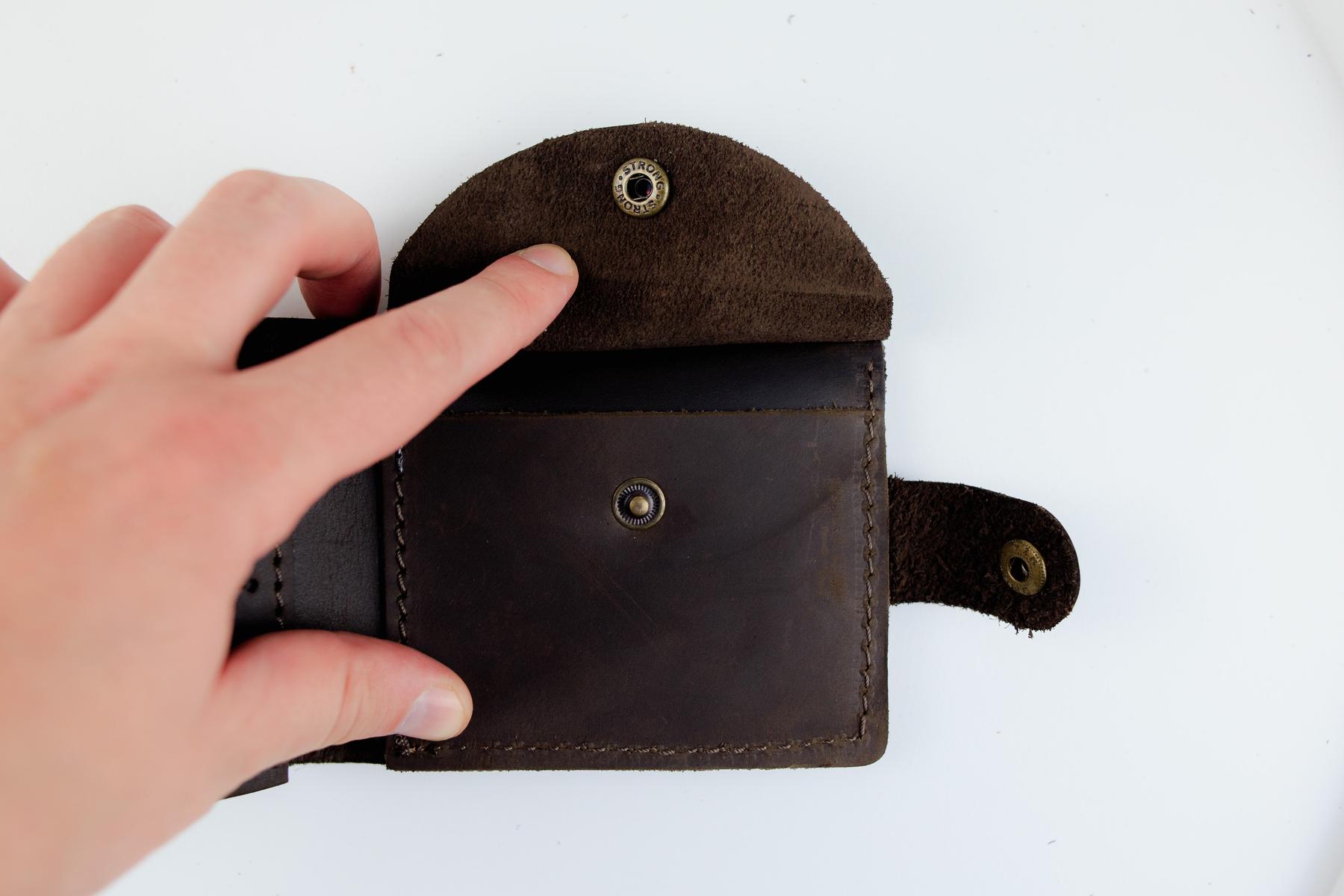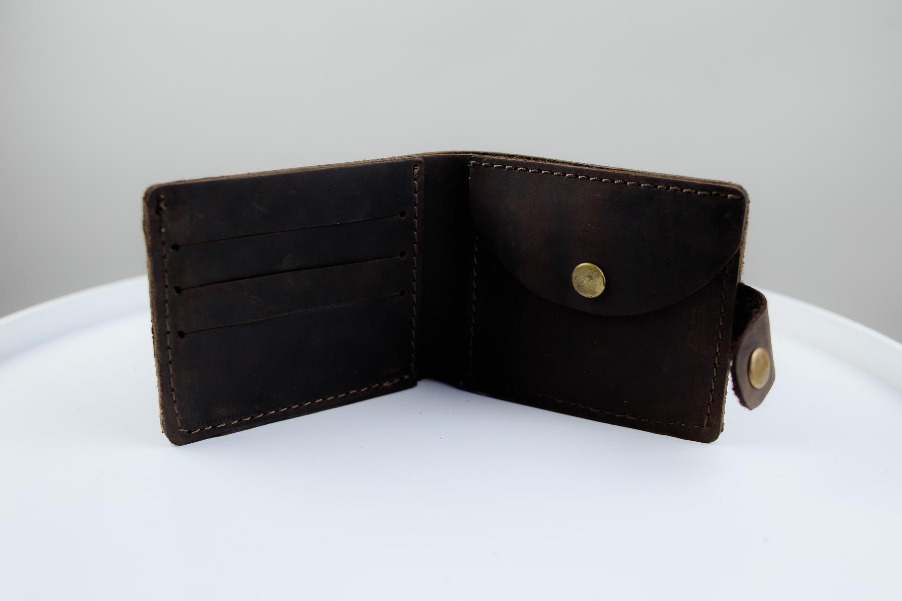 Мужской кошелек Skill коричневого цвета выполнен из натуральной кожи. Кошелек застегивается металлической кнопкой, имеет основное отделение для купюр, 4 ячейки для карточек и одно отделение для монет на кнопке.