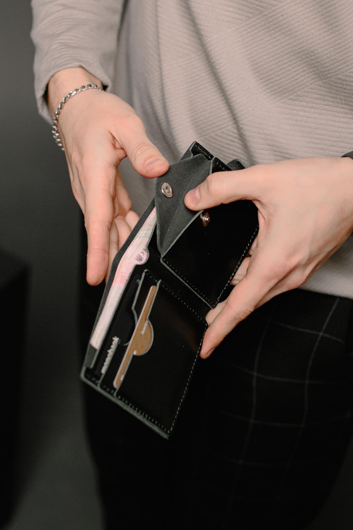 Мужской кошелек Skill черного цвета выполнен из натуральной кожи. Кошелек застегивается металлической кнопкой, имеет основное отделение для купюр, три ячейки для карточек и одно отделение для монет на кнопке.