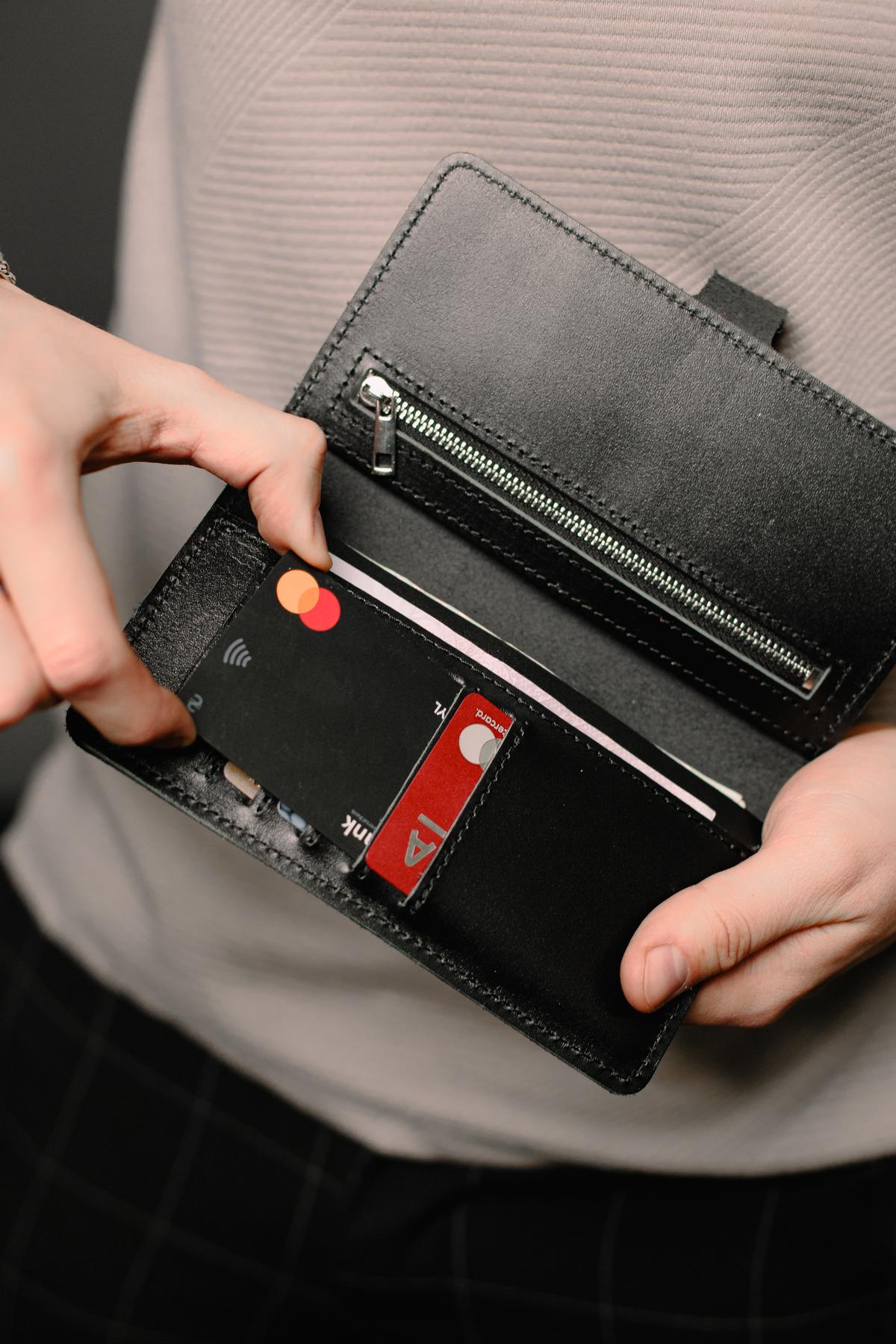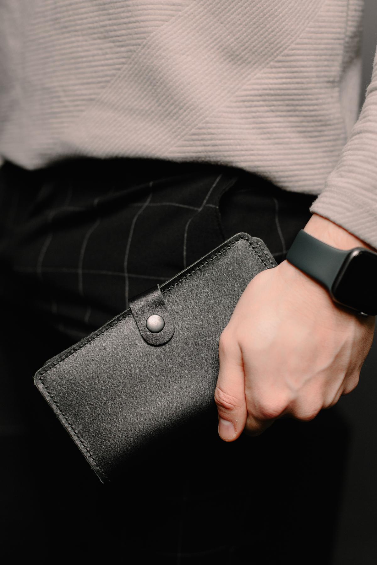 Портмоне мужское Skill черного цвета изготовлено из натуральной кожи. Портмоне застегивается металлической кнопкой, имеет три основных отделения для купюр, 6 ячеек для карточек и дополнительное отделение на металлической молнии.