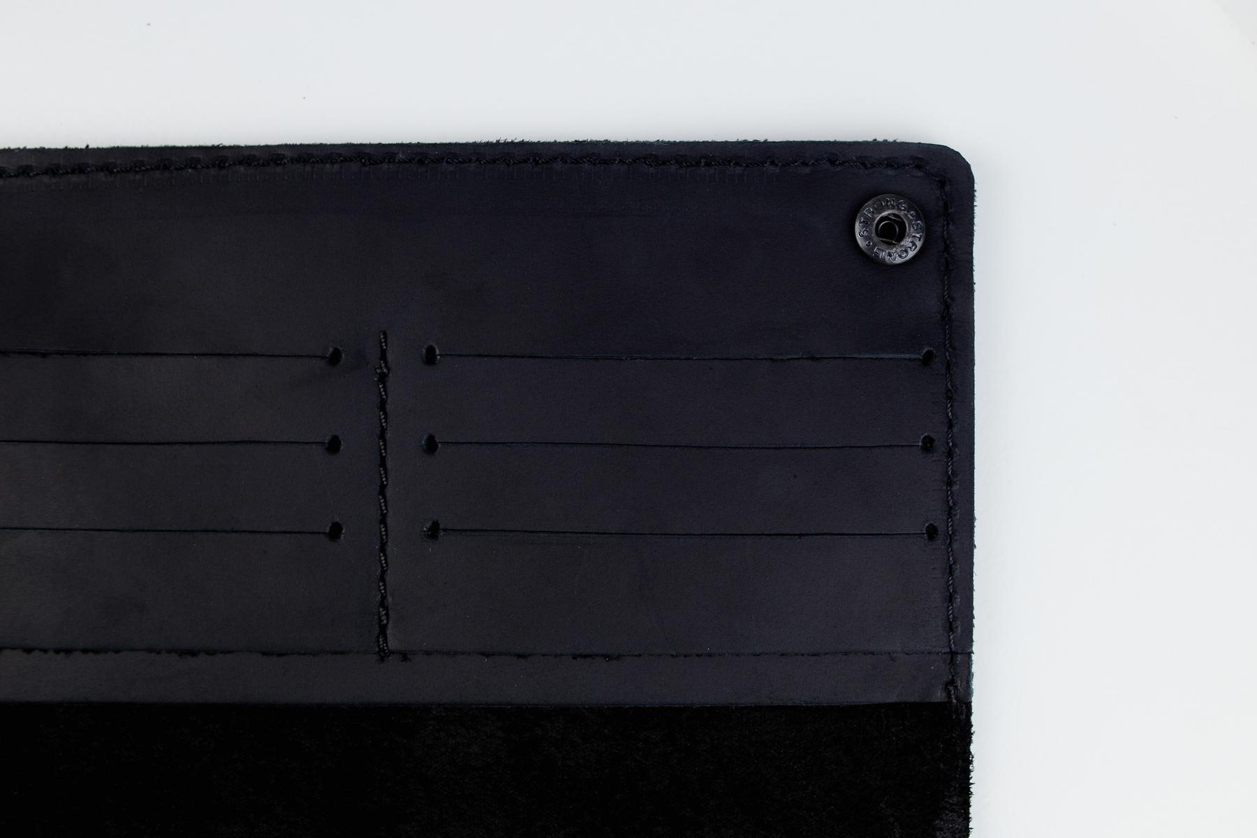 Мужское портмоне Skill Crazy Horse черного цвета изготовлено из натуральной кожи. Портмоне застегивается на металлические кнопки, имеет два основных отделения для купюр и 12 ячеек для карточек.
