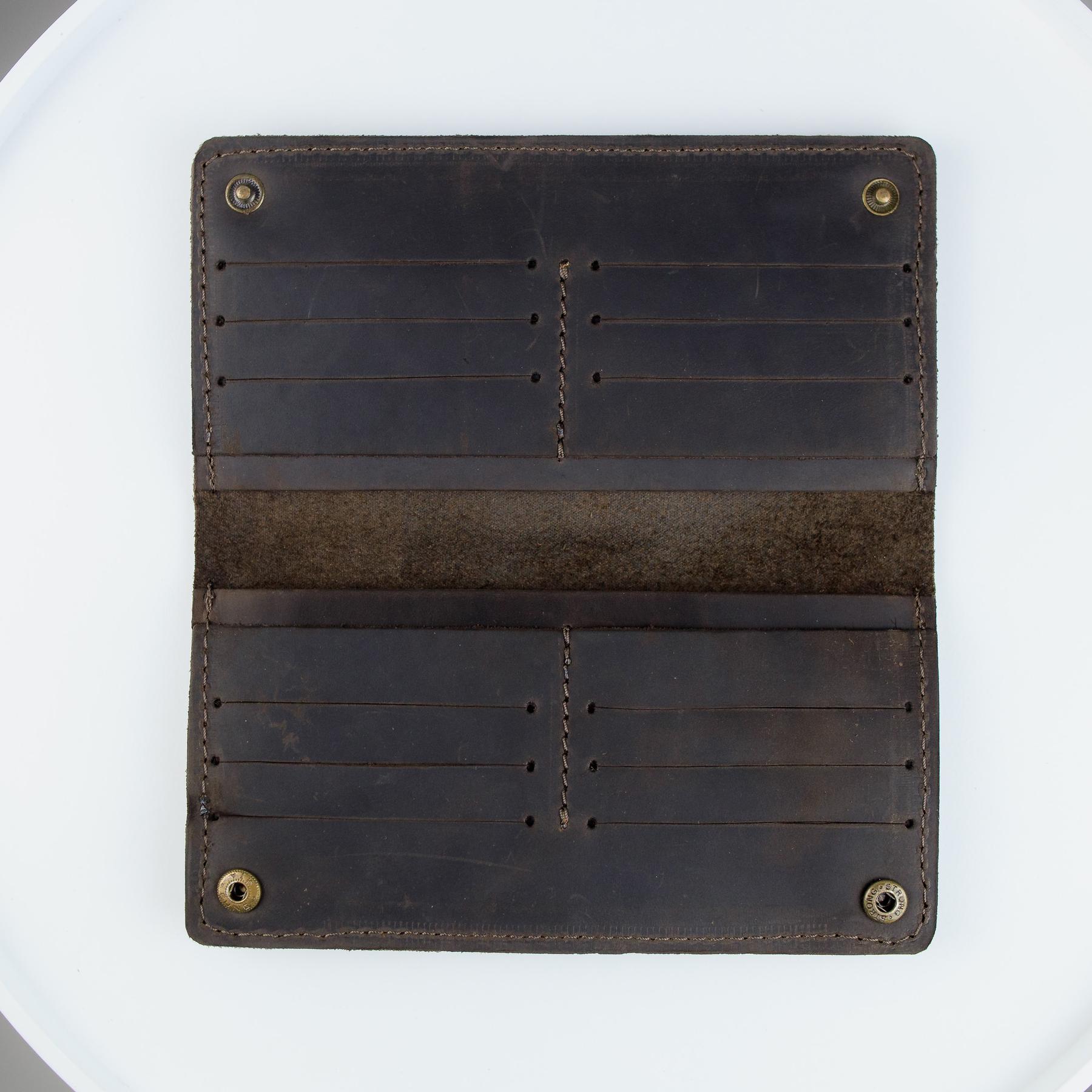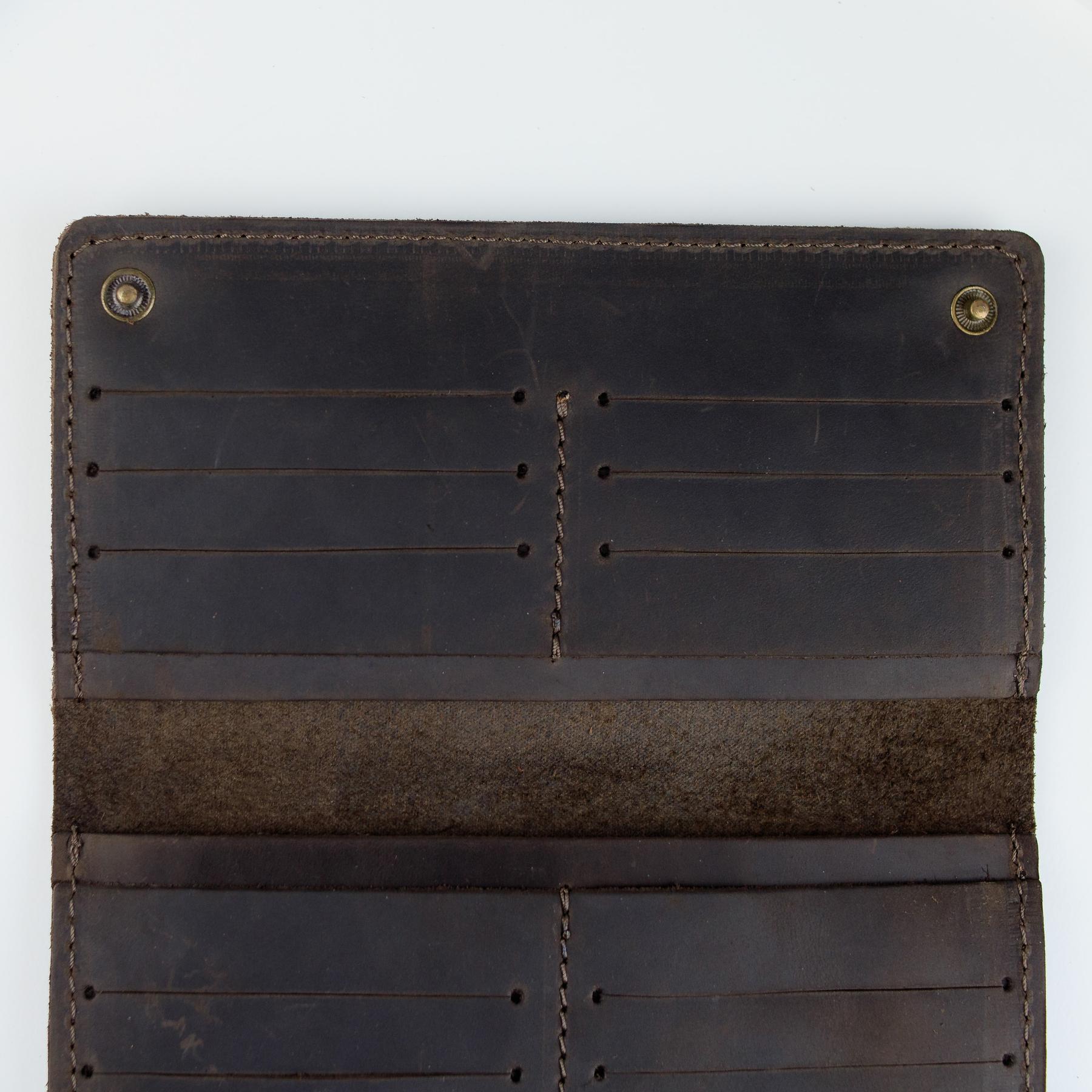 Мужское портмоне Skill Crazy Horse коричневого цвета изготовлено из натуральной кожи. Портмоне застегивается на металлические кнопки, имеет два основных отделения для купюр и 12 ячеек для карточек.
