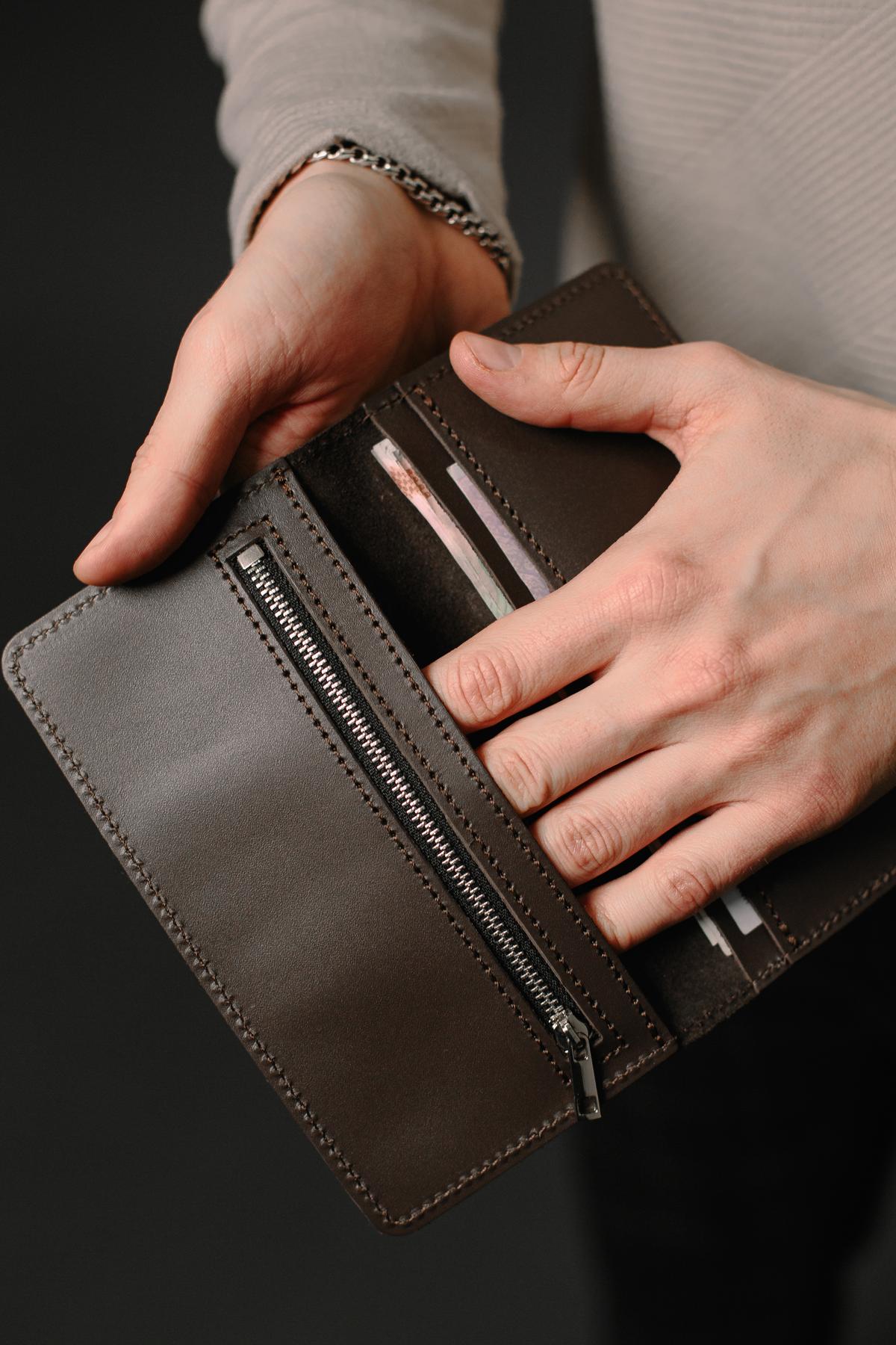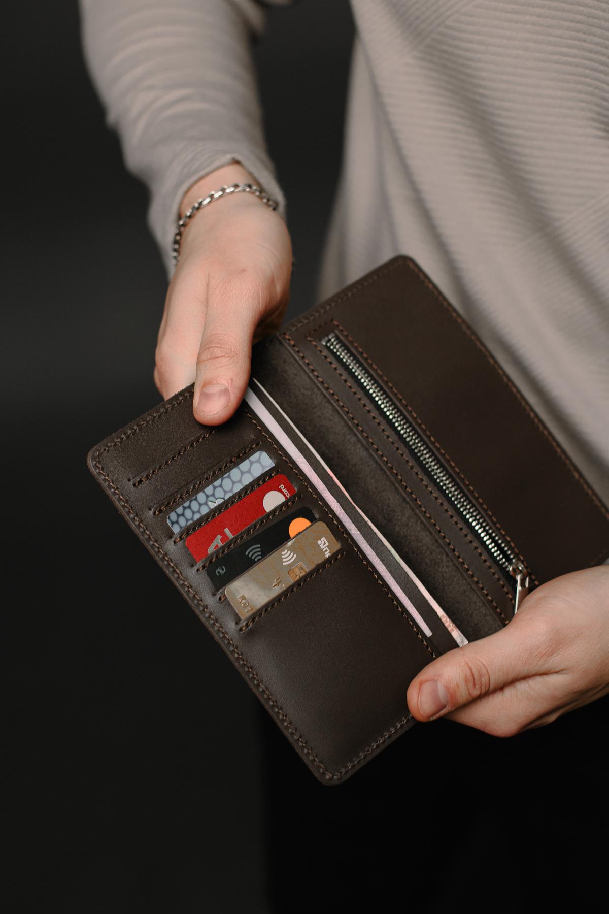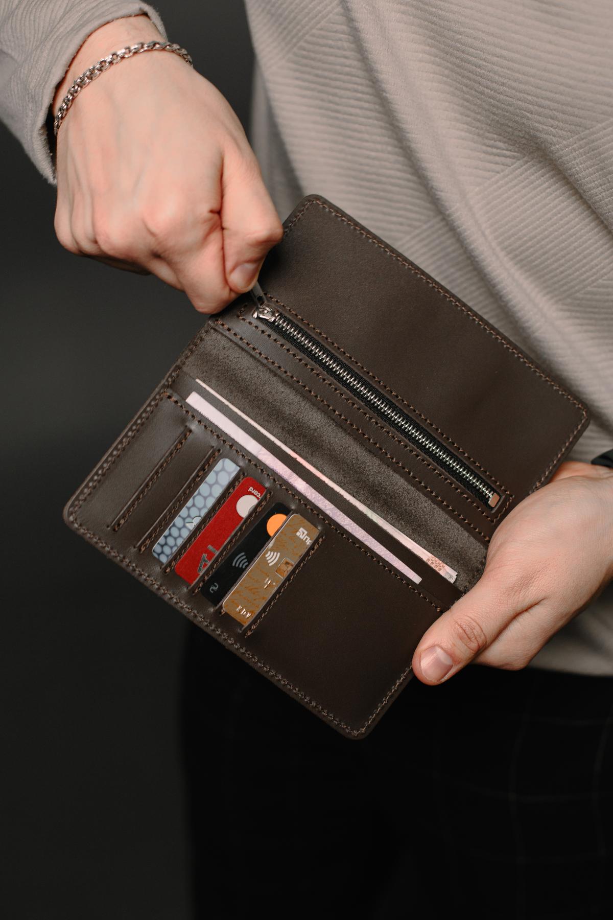 Портмоне мужское Skill коричневого цвета изготовлено из натуральной кожи. Портмоне имеет три основных отделения для купюр, 6 ячеек для карточек и дополнительное отделение на металлической молнии.