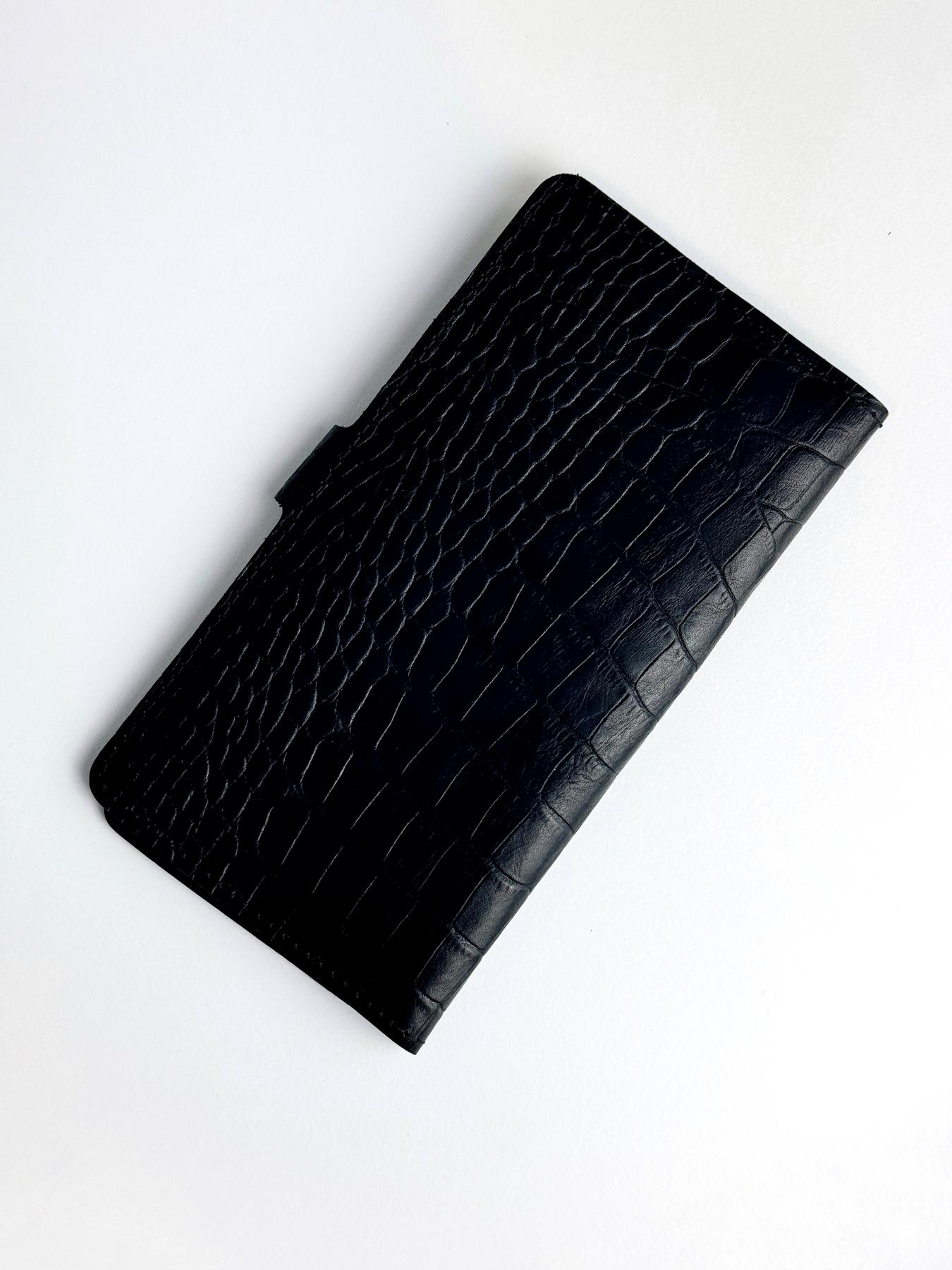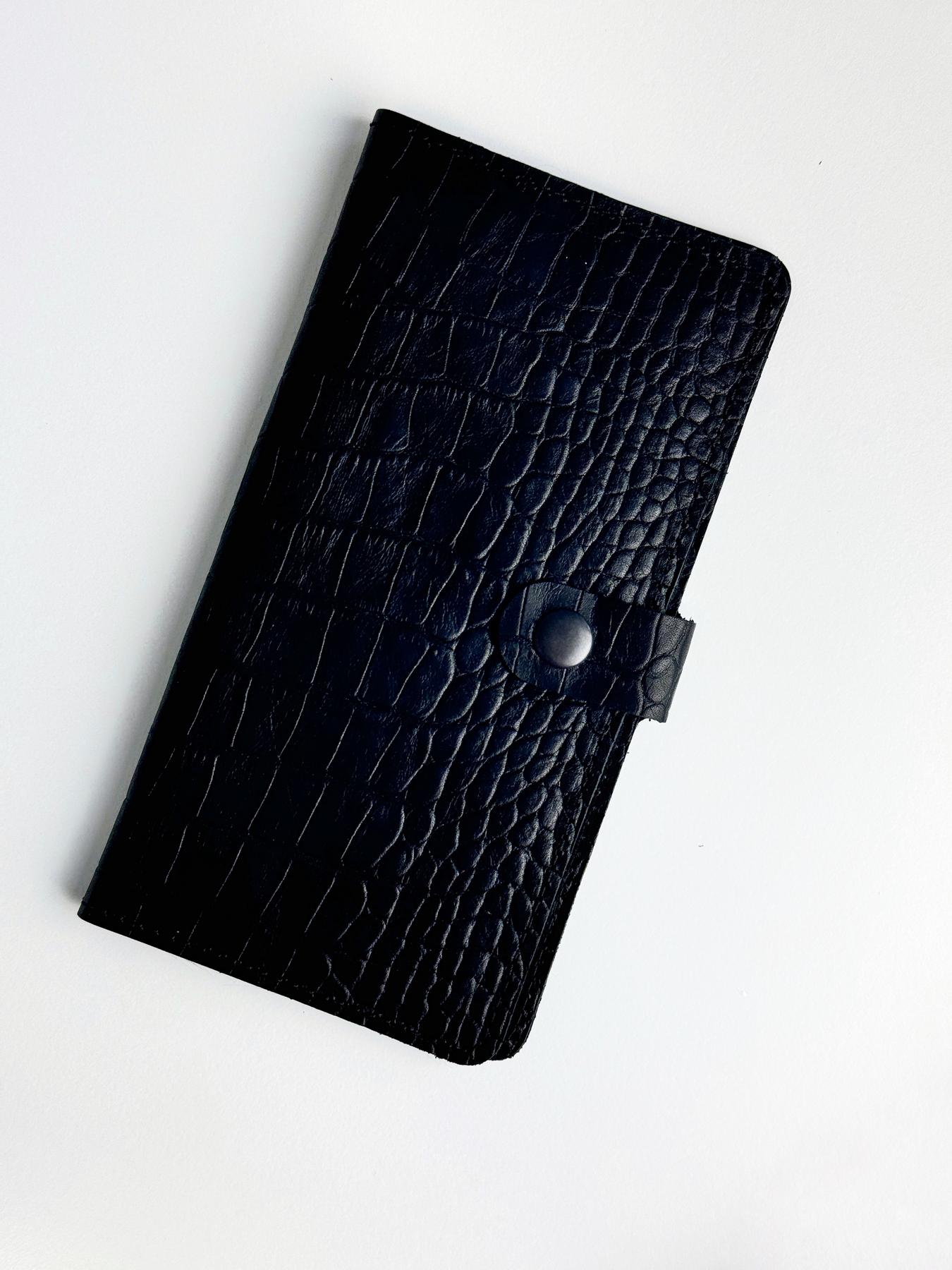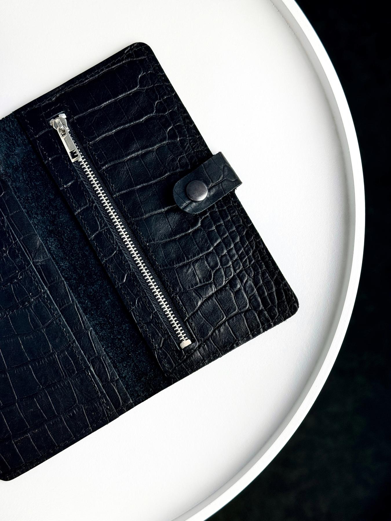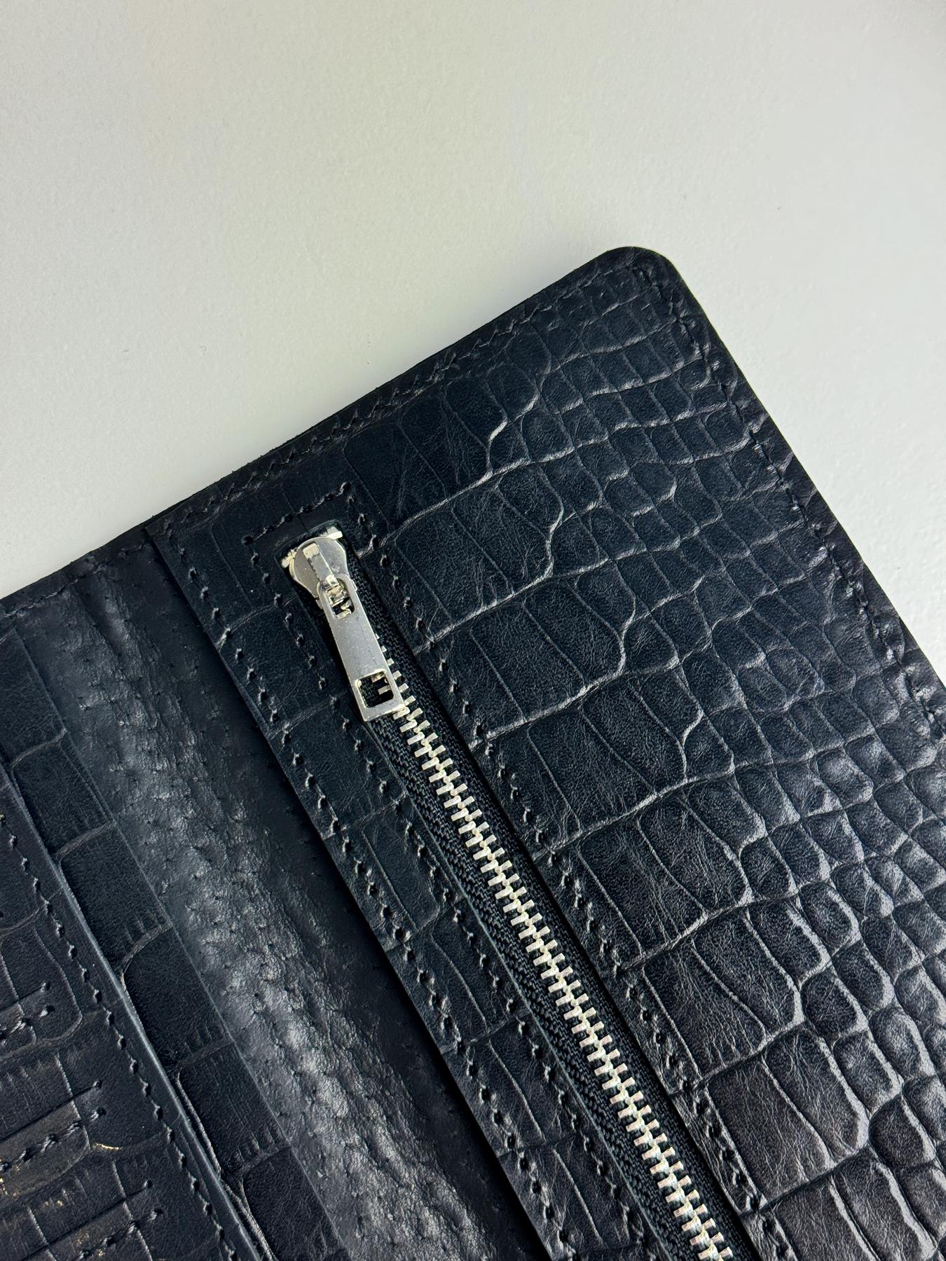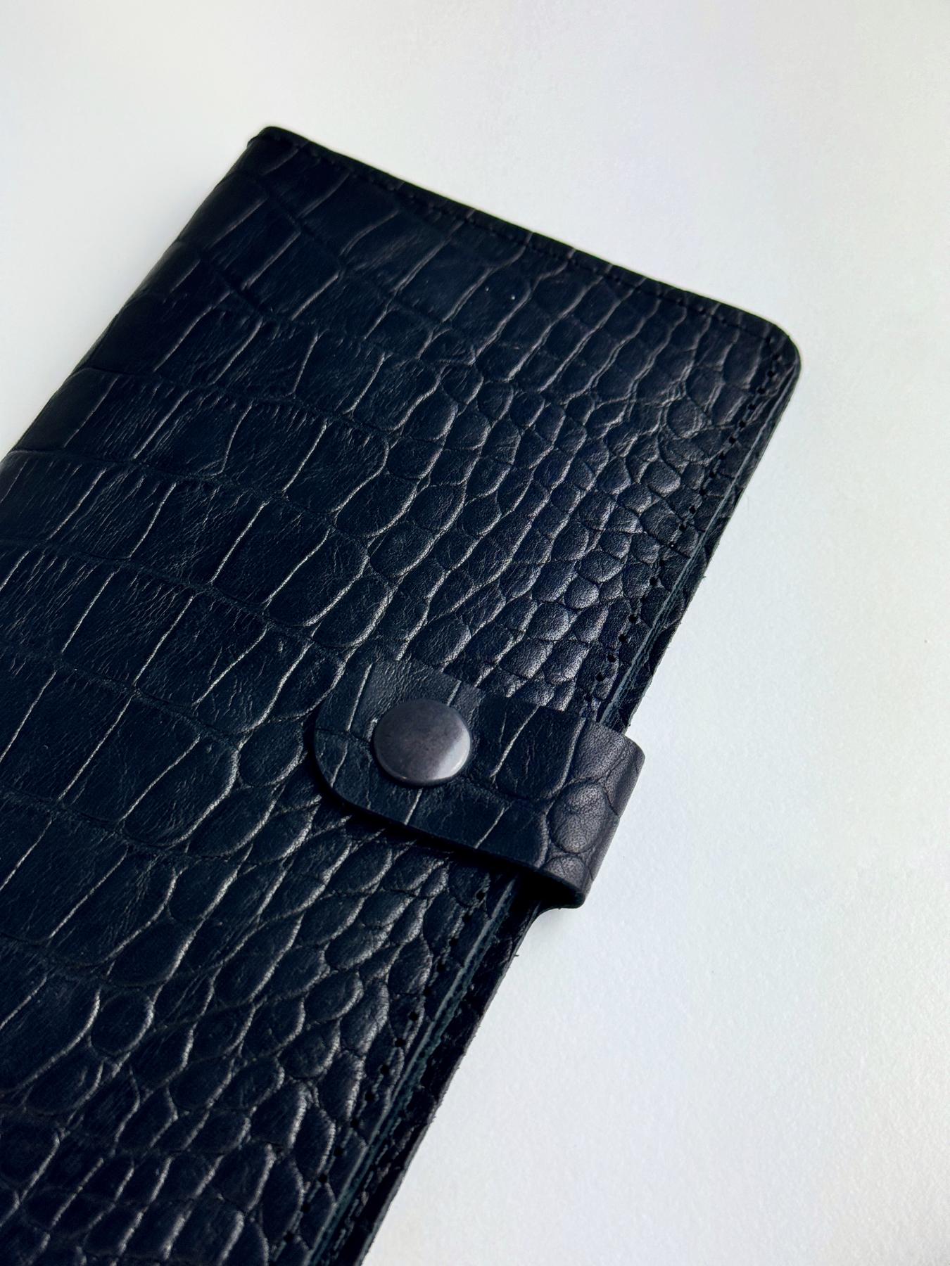 Портмоне мужское Skill черного цвета изготовлено из натуральной кожи. Портмоне застегивается металлической кнопкой, имеет три основных отделения для купюр, 6 ячеек для карточек и дополнительное отделение на металлической молнии.