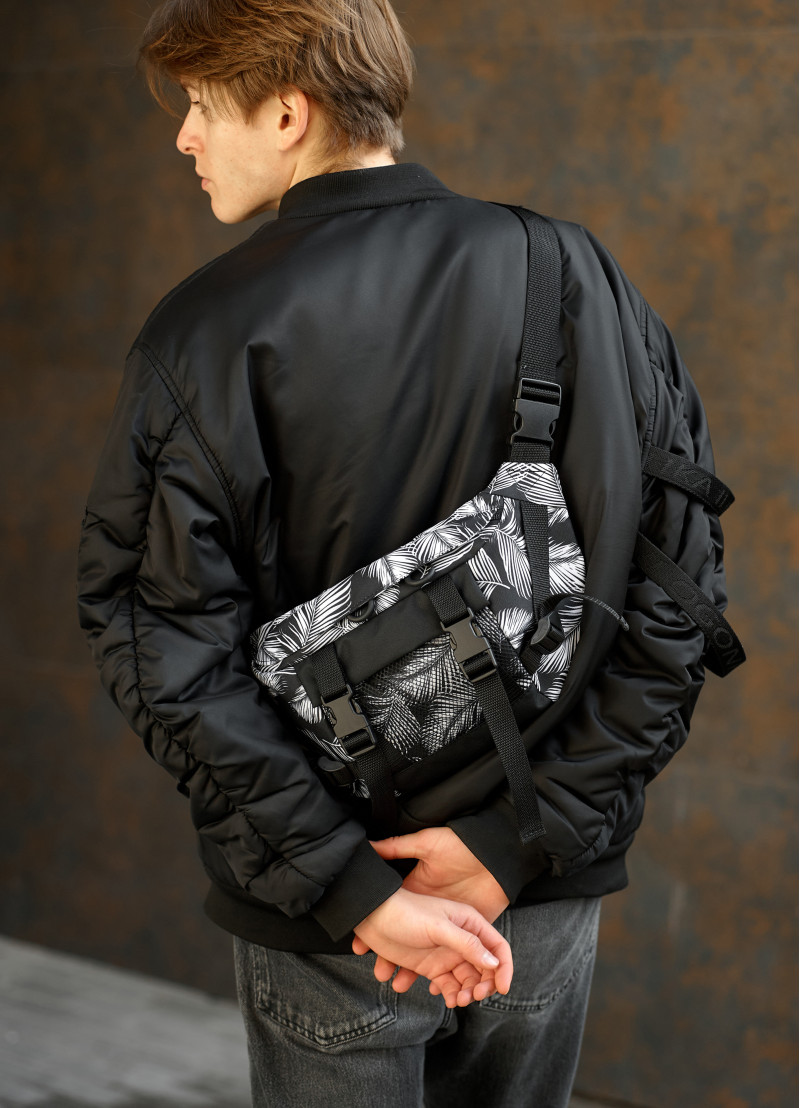 Мусжкая сумка-бананка Sambag Dynamicdart с бело-черным пальмовым принтом имеет 9 отделений и выполнена из качественного полиэстера. В середине подкладка из материала Оксфорд. Сумка имеет качественную пластиковую молнию с металлическими бегунками с фиксаторами, поэтому сумка самостоятельно открываться не будет. Кроме основного отделения бананка имеет два открытых кармана, один большой карман на молнии в котором еще три открытых кармана. На наружной стороне спереди карман из сетки. Сззади бананки два открытых кармана. Ремешок регулируется от 86 см до 168 см, благодаря чему ее можно удобно носить как поясную сумку, так и как полноценную через плечо.