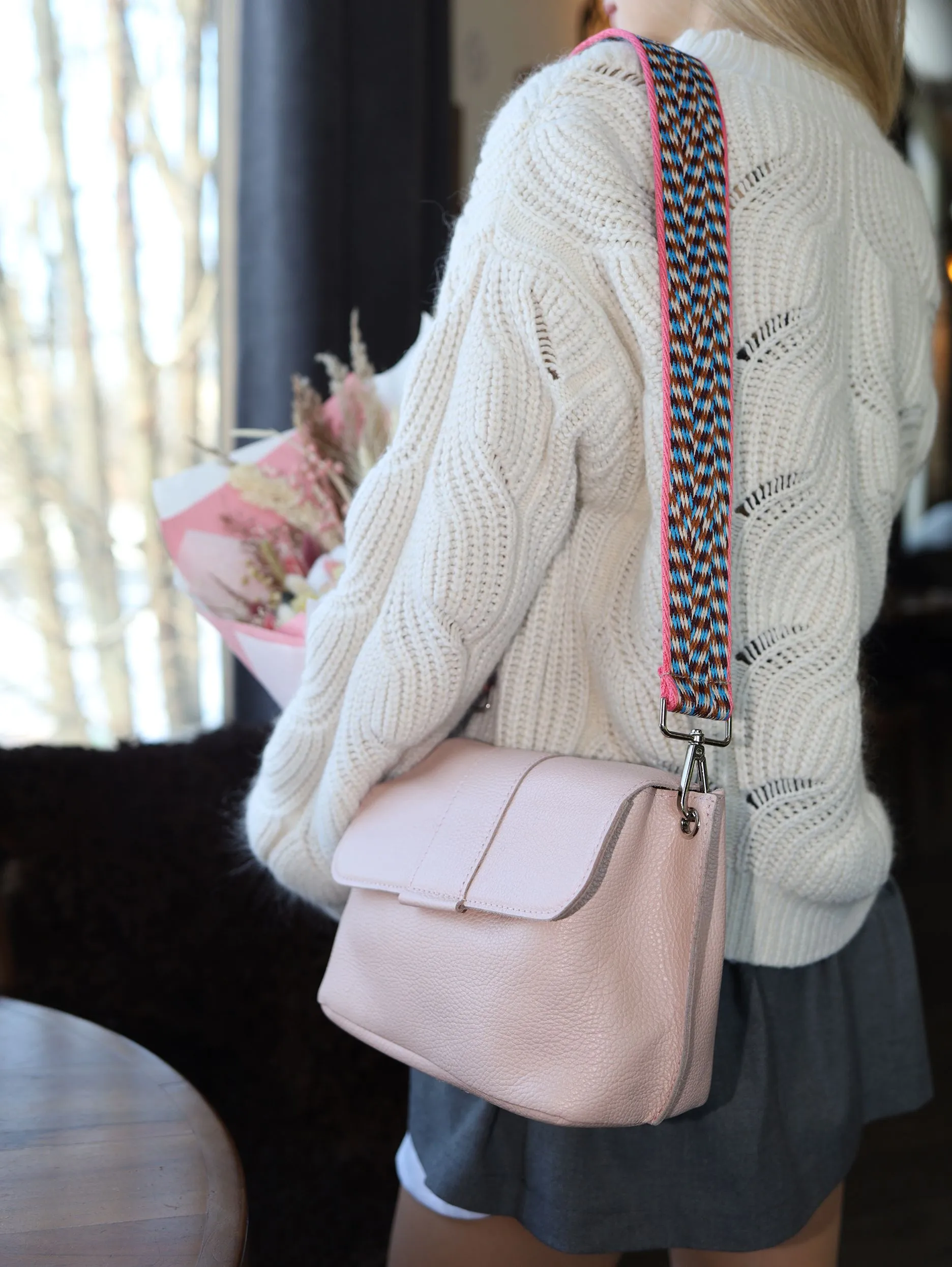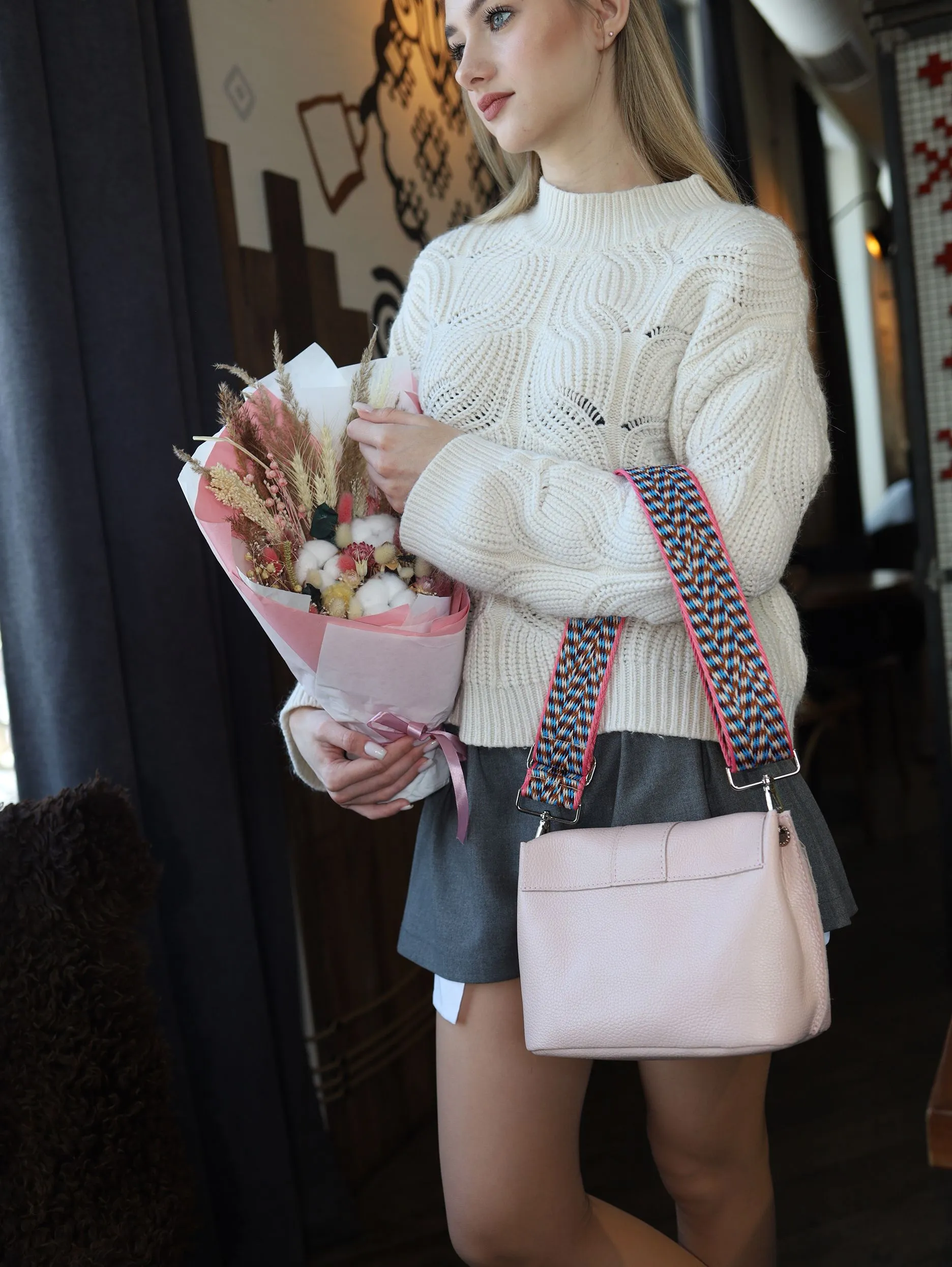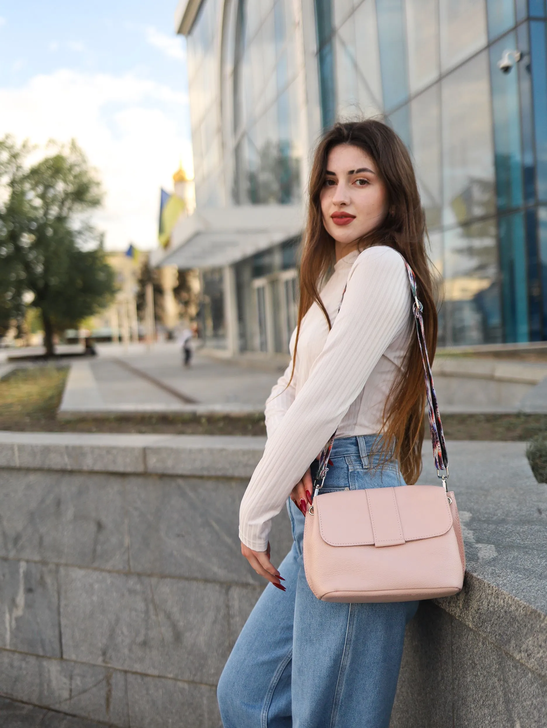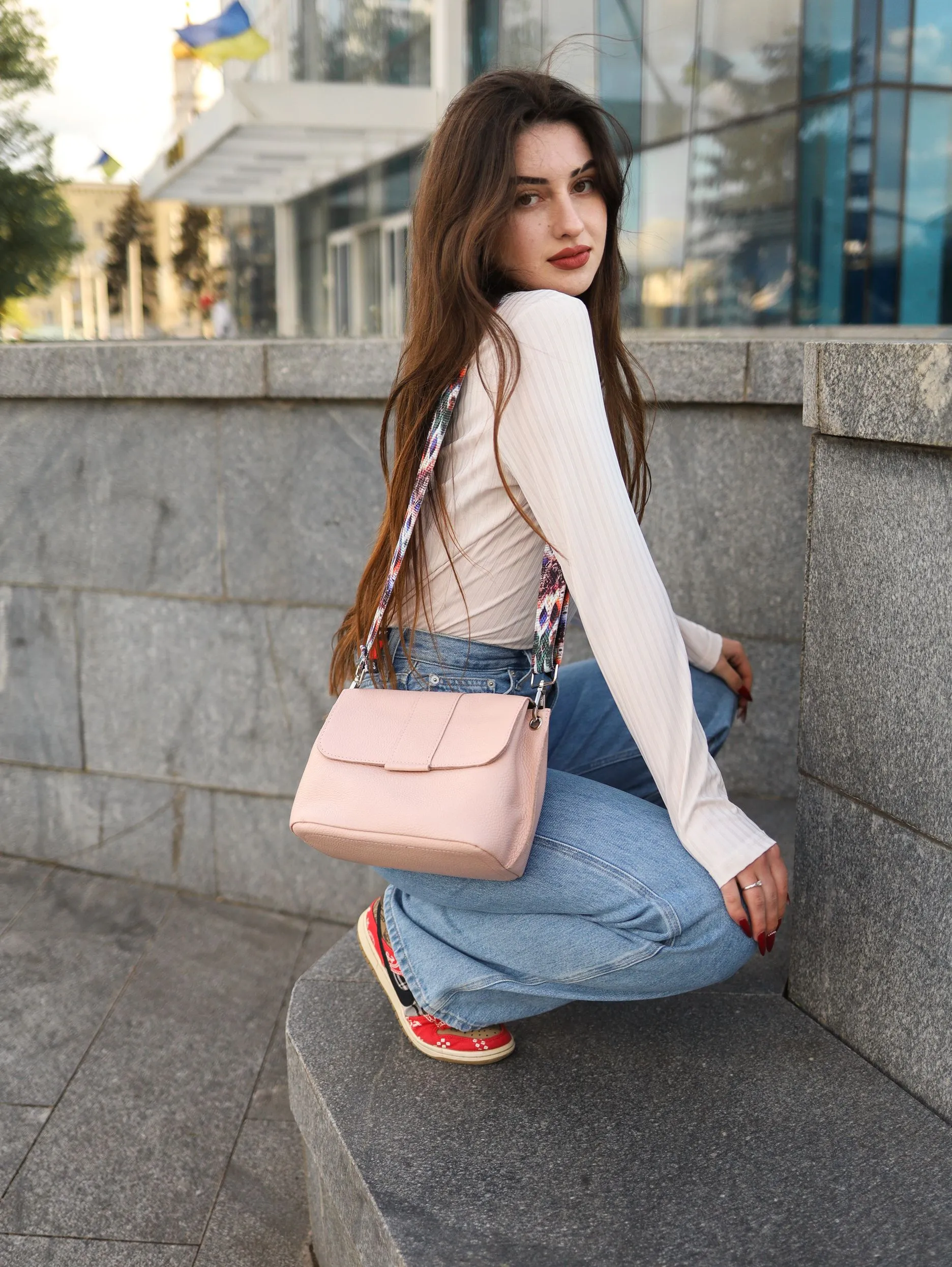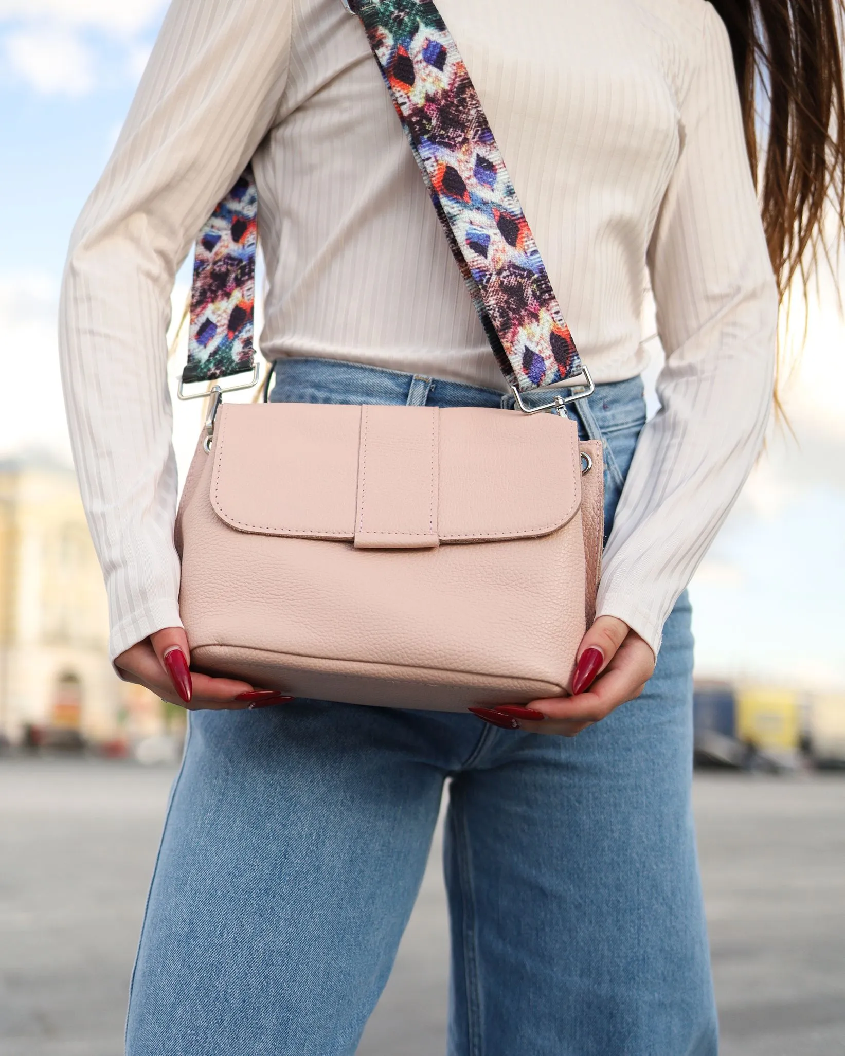 Женская сумка кросс-боди Miros Марокко пудрового цвета выполнена из натуральной кожи флотар. Сумка снабжена качественной металлической фурнитурой. Есть три отделения, одно открытое, одно на металлической молнии и одно на кнопке. Закрывается сумка также на кнопку. Ремешок регулируется от 80 см до 115 см. Благодаря такой стильной дамской сумочке вы будете выделяться среди толпы и иметь с собой всегда все необходимое.