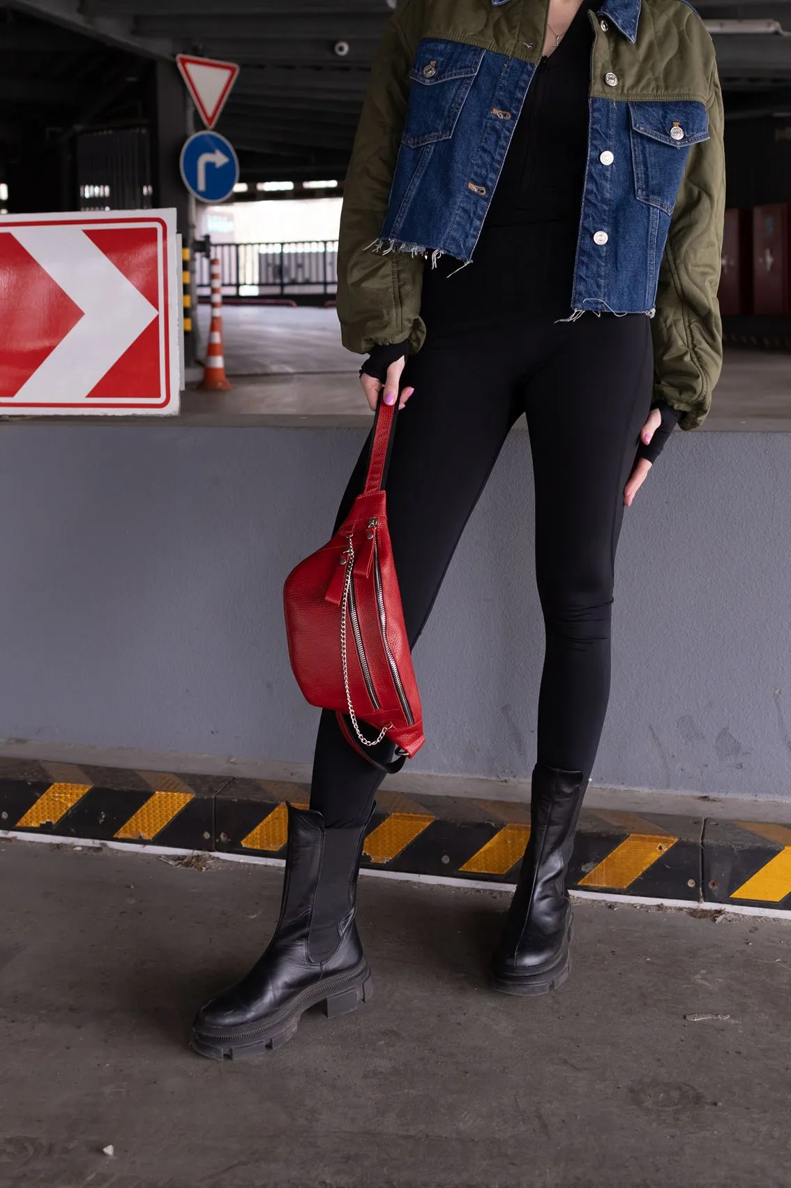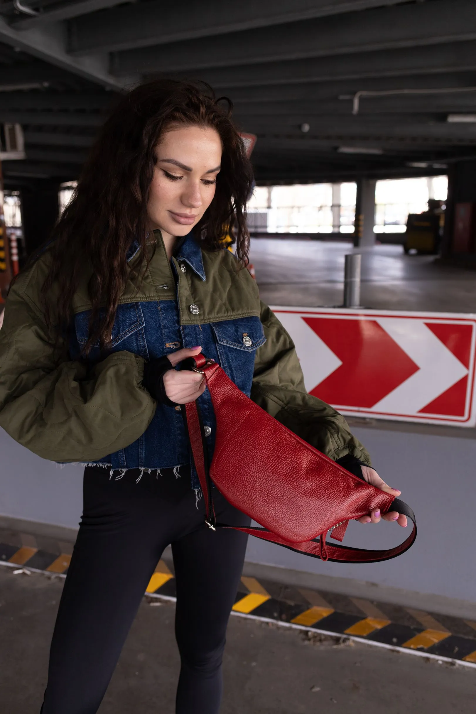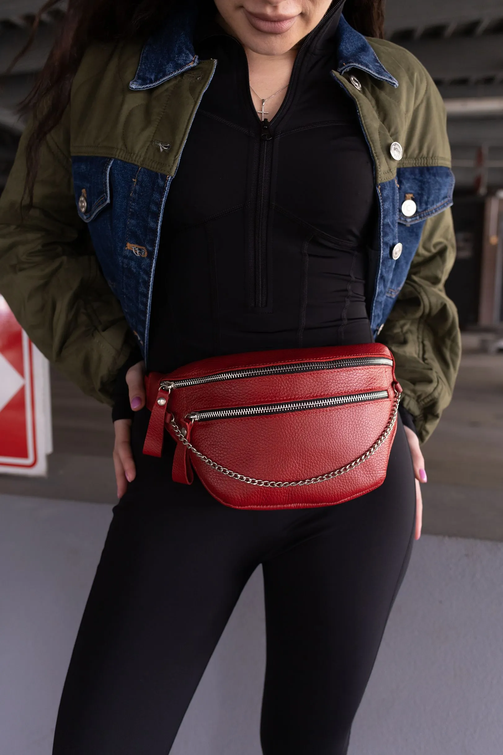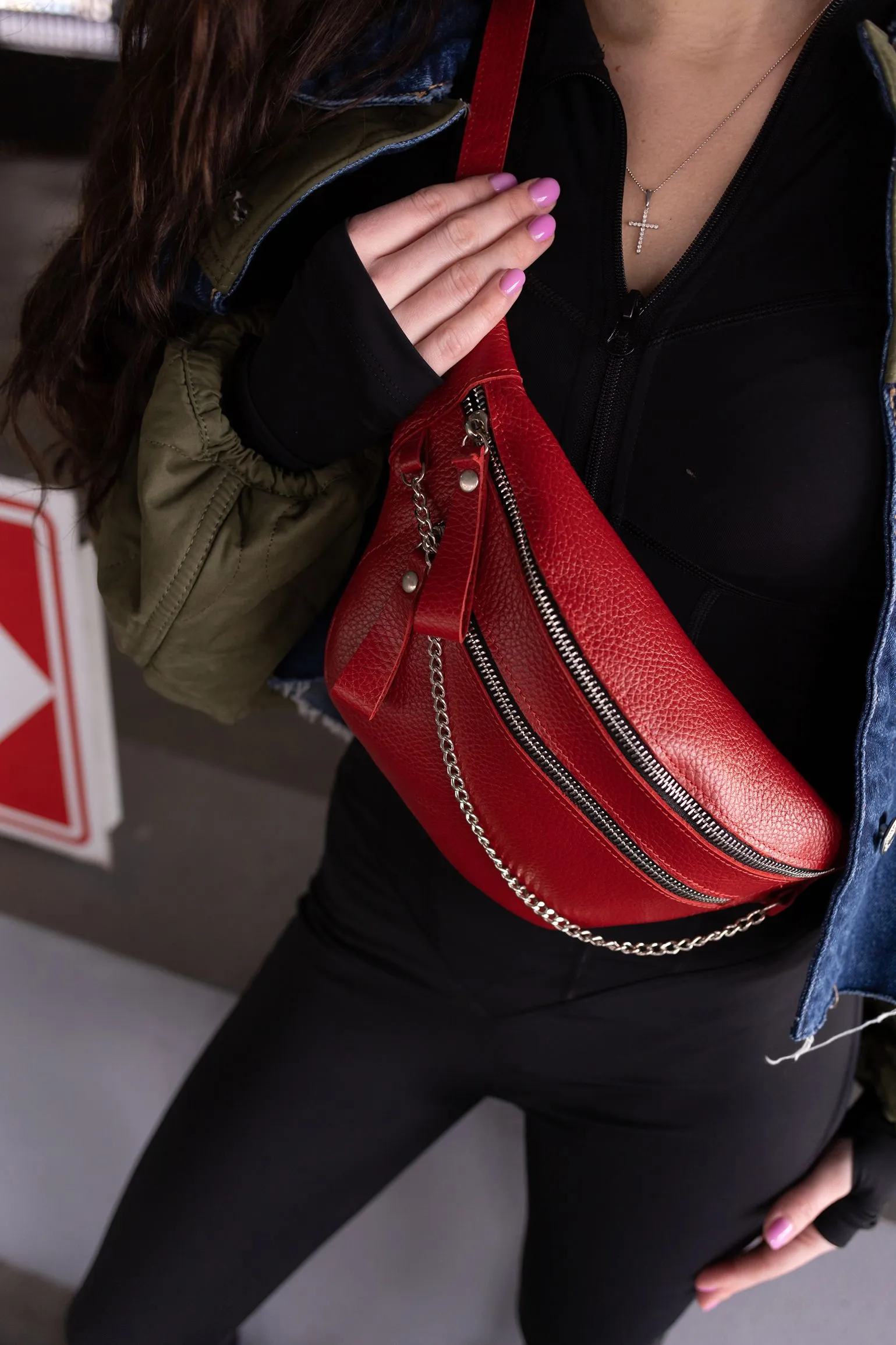Женская бананка с цепочкой Miros Sorrento красного цвета выполнена из натуральной кожи. Бананка оснащена качественными металлическими молниями с металлическими бегунками с фиксаторами. У сумки одно основное отделение с дополнительным кожаным карманом, для телефона или других вещей. Снаружи с лицевой стороны дополнительное отделение на молнии. Ремешок регулируется, благодаря чему ее можно удобно носить как на поясе, так и на плече.